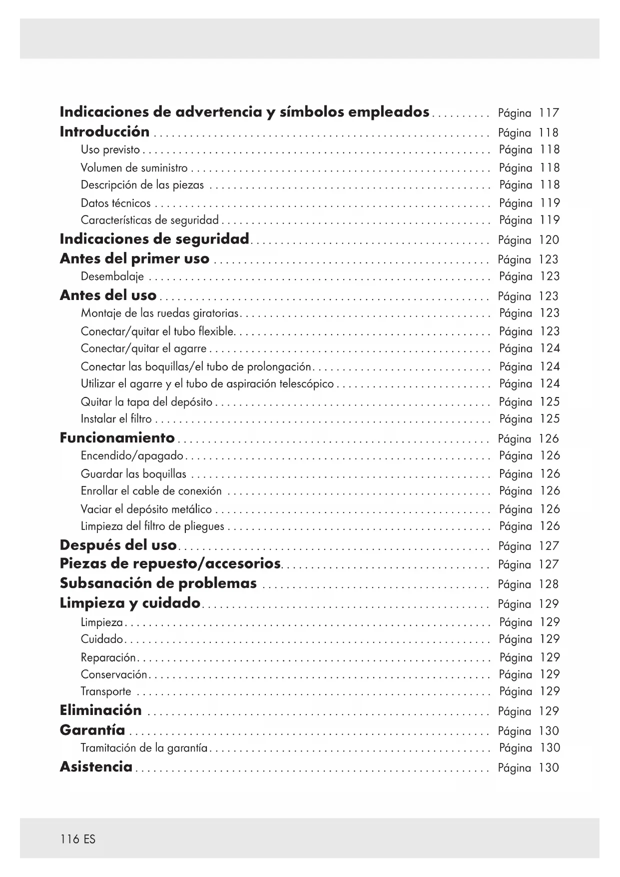 Indicaciones de advertencia y símbolos empleados ........ . . Página 117 Introducción ...................................................... . . Página 118 Uso previsto ........................................................ . . Página 118 Volumen de suministro ................................................ . . Página 118 Descripción de las piezas ............................................. . . Página 118 Datos técnicos ...................................................... . . Página 119 Características de seguridad ........................................... . . Página 119 Indicaciones de seguridad...................................... . . Página 120 Antes del primer uso ............................................ . . Página 123 Desembalaje ....................................................... . . Página 123 Antes del uso ..................................................... . . Página 123 Montaje de las ruedas giratorias........................................ . . Página 123 Conectar/quitar el tubo flexible......................................... . . Página 123 Conectar/quitar el agarre ............................................. . . Página 124 Conectar las boquillas/el tubo de prolongación............................ . . Página 124 Utilizar el agarre y el tubo de aspiración telescópico ........................ . . Página 124 Quitar la tapa del depósito ............................................ . . Página 125 Instalar el filtro ...................................................... . . Página 125 Funcionamiento .................................................. . . Página 126 Encendido/apagado................................................. . . Página 126 Guardar las boquillas ................................................ . . Página 126 Enrollar el cable de conexión .......................................... . . Página 126 Vaciar el depósito metálico ............................................ . . Página 126 Limpieza del filtro de pliegues .......................................... . . Página 126 Después del uso.................................................. . . Página 127 Piezas de repuesto/accesorios................................. . . Página 127 Subsanación de problemas .................................... . . Página 128 Limpieza y cuidado.............................................. . . Página 129 Limpieza........................................................... . . Página 129 Cuidado........................................................... . . Página 129 Reparación......................................................... . . Página 129 Conservación....................................................... . . Página 129 Transporte ......................................................... . . Página 129 Eliminación ....................................................... . . Página 129 Garantía .......................................................... . . Página 130 Tramitación de la garantía............................................. . . Página 130 Asistencia ......................................................... . . Página 130117