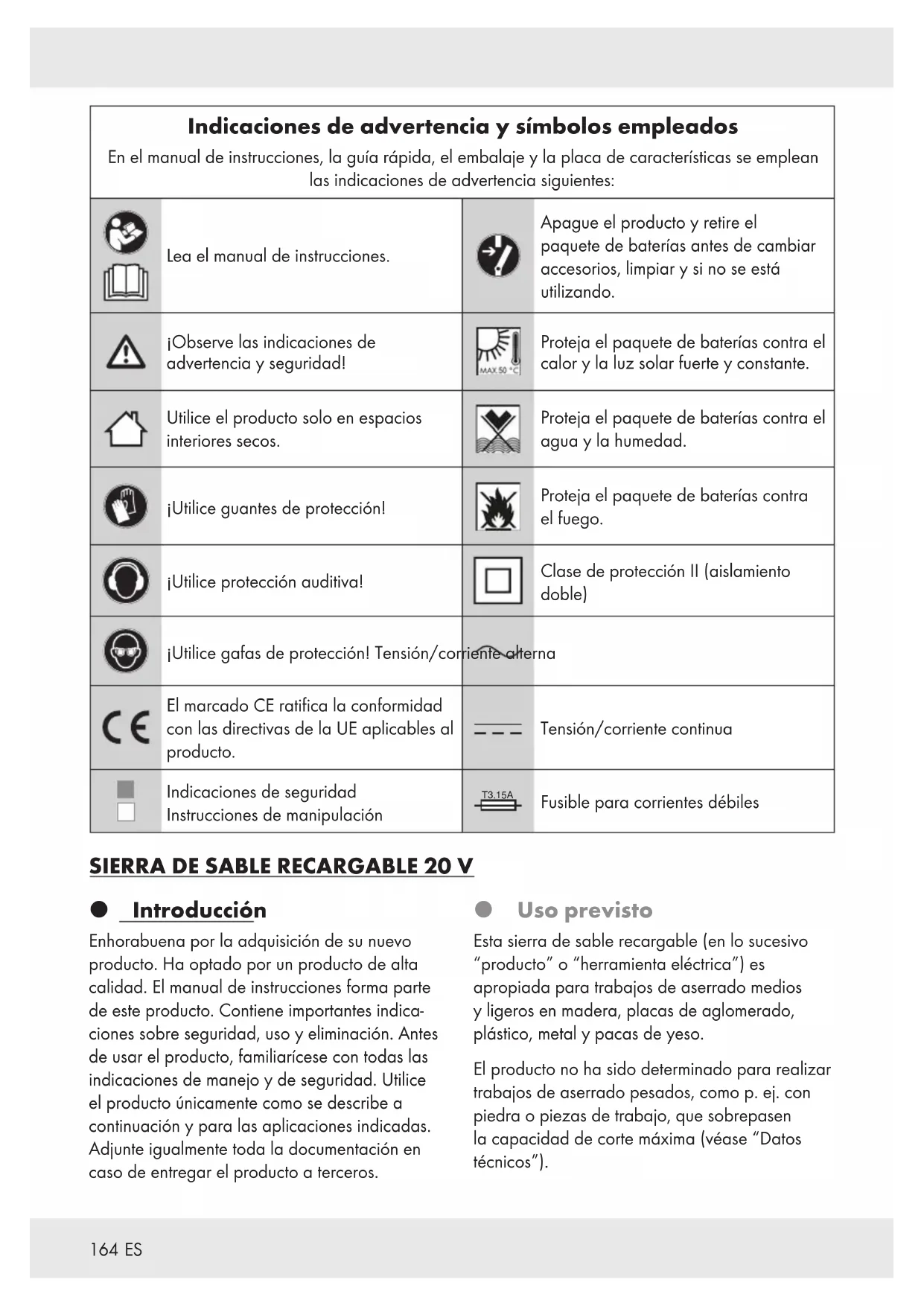 Introducción Enhorabuena por la adquisición de su nuevo producto. Ha optado por un producto de alta calidad. El manual de instrucciones forma parte de este producto. Contiene importantes indica- ciones sobre seguridad, uso y eliminación. Antes de usar el producto, familiarícese con todas las indicaciones de manejo y de seguridad. Utilice el producto únicamente como se describe a continuación y para las aplicaciones indicadas. Adjunte igualmente toda la documentación en caso de entregar el producto a terceros. Uso previsto Esta sierra de sable recargable (en lo sucesivo “producto” o “herramienta eléctrica”) es apropiada para trabajos de aserrado medios y ligeros en madera, placas de aglomerado, plástico, metal y pacas de yeso. El producto no ha sido determinado para realizar trabajos de aserrado pesados, como p.ej. con piedra o piezas de trabajo, que sobrepasen la capacidad de corte máxima (véase “Datos técnicos”).165