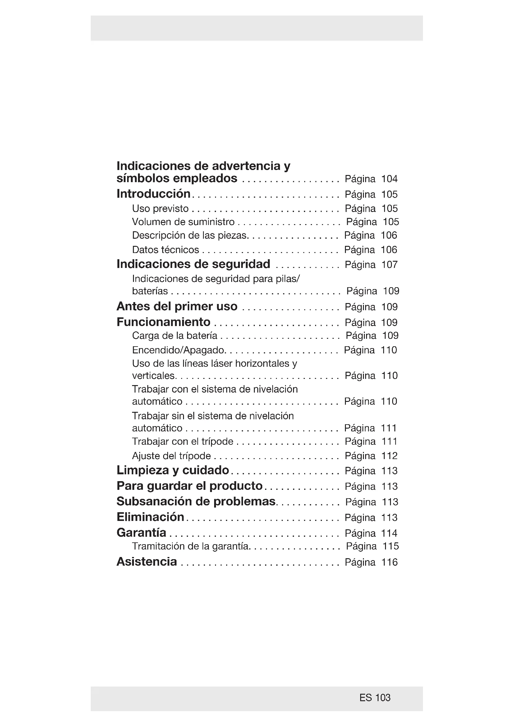 Indicaciones de advertencia y símbolos empleados .................. Página 104 Introducción........................... Página 105 Uso previsto ........................... Página 105 Volumen de suministro ................... Página 105 Descripción de las piezas................. Página 106 Datos técnicos ......................... Página 106 Indicaciones de seguridad ............ Página 107 Indicaciones de seguridad para pilas/ baterías ............................... Página 109 Antes del primer uso .................. Página 109 Funcionamiento ....................... Página 109 Carga de la batería ...................... Página 109 Encendido/Apagado..................... Página 110 Uso de las líneas láser horizontales y verticales.............................. Página 110 Trabajar con el sistema de nivelación automático ............................ Página 110 Trabajar sin el sistema de nivelación automático ............................ Página 111 Trabajar con el trípode ................... Página 111 Ajuste del trípode ....................... Página 112 Limpieza y cuidado.................... Página 113 Para guardar el producto.............. Página 113 Subsanación de problemas............ Página 113 Eliminación ............................ Página 113 Garantía ............................... Página 114 Tramitación de la garantía................. Página 115 Asistencia ............................. Página 116104