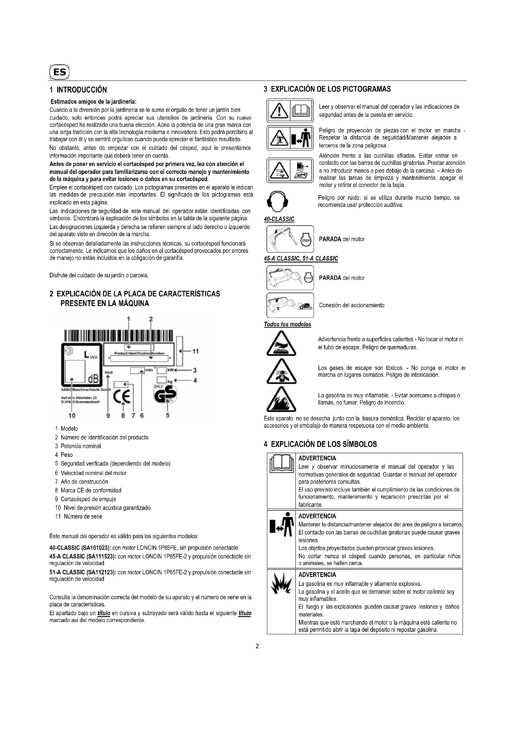 Este manual del operador es válido para los siguientes modelos: Pos: 9.9 /Innentei l/Einführung/TYP 47-VARIO/E/A/ECO/R 47/R47S/R47V @ 65\ mod_15943 00932359_6.docx @ 632989 @ @ 1 40-CLASSIC (SA101023): con motor LONCIN 1P65FE, sin propulsión conectable 45-A CLASSIC (SA111523): con motor LONCIN 1P65FE-2 y propulsión conectable sin regulación de velocidad 51-A CLASSIC (SA112123): con motor LONCIN 1P65FE-2 y propulsión conectable sin regulación de velocidad Consulte la denominación correcta del modelo de su aparato y el número de serie en la placa de características. El apartado bajo un título en cursiva y subrayado será válido hasta el siguiente título marcado así del modelo correspondiente.
