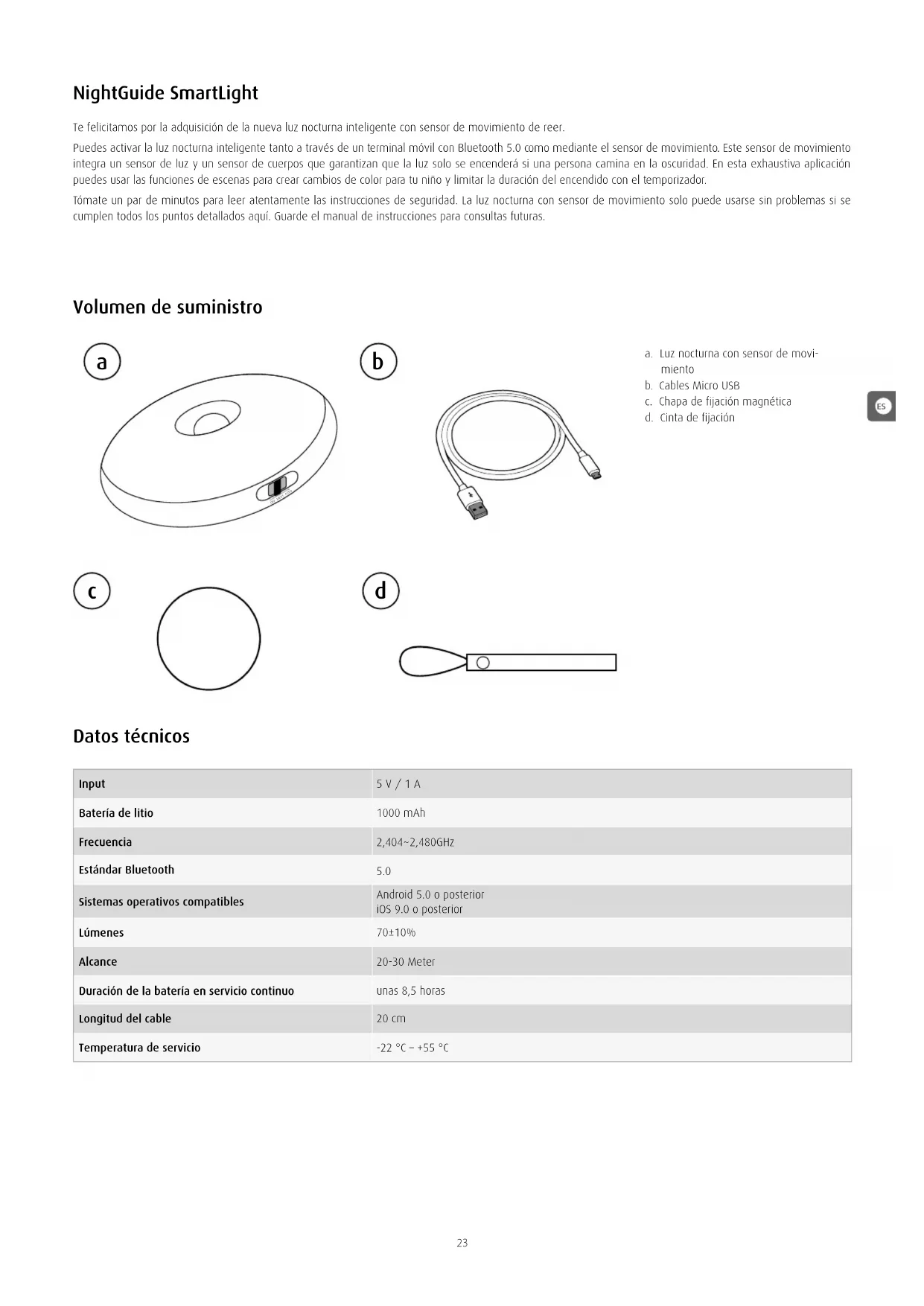 Sistemas operativos compatibles Android 5.0 o posterior iOS 9.0 o posterior Lúmenes 70±10% Alcance 20-30 Meter Duración de la batería en servicio continuo unas 8,5 horas Longitud del cable 20 cm Temperatura de servicio -22 °C – +55 °C Datos técnicos NightGuide SmartLight Te felicitamos por la adquisición de la nueva luz nocturna inteligente con sensor de movimiento de reer. Puedes activar la luz nocturna inteligente tanto a través de un terminal móvil con Bluetooth 5.0 como mediante el sensor de movimiento. Este sensor de movimiento integra un sensor de luz y un sensor de cuerpos que garantizan que la luz solo se encenderá si una persona camina en la oscuridad. En esta exhaustiva aplicación puedes usar las funciones de escenas para crear cambios de color para tu niño y limitar la duración del encendido con el temporizador. Tómate un par de minutos para leer atentamente las instrucciones de seguridad. La luz nocturna con sensor de movimiento solo puede usarse sin problemas si se cumplen todos los puntos detallados aquí. Guarde el manual de instrucciones para consultas futuras. Volumen de suministro a. Luz nocturna con sensor de movi- miento b. Cables Micro USB c. Chapa de fijación magnética d. Cinta de fijación