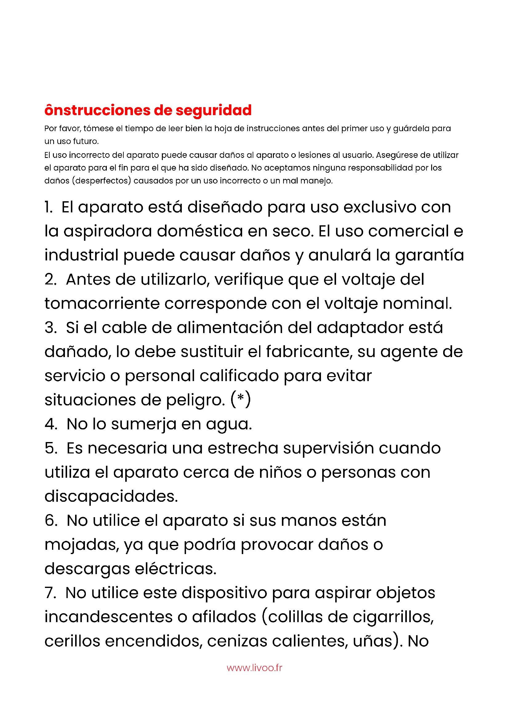 incandescentes o afilados (colillas de cigarrillos, cerillos encendidos, cenizas calientes, uñas). Nowww.livoo.fr aspire ningún objeto a temperaturas superiores a 40 °C.