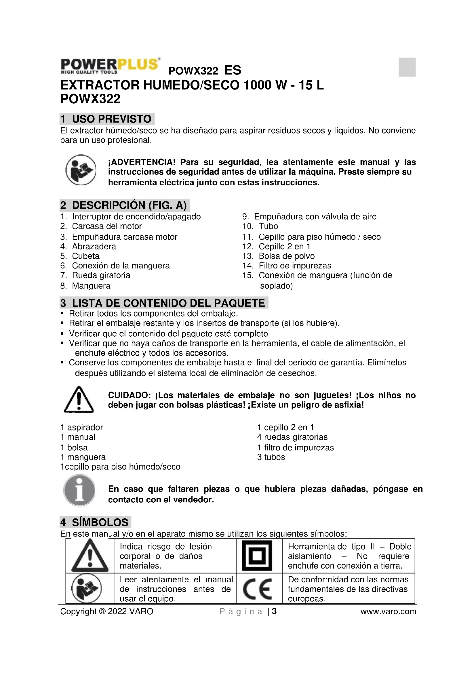 - Conserve los componentes de embalaje hasta el final del periodo de garantía. Elimínelos después utilizando el sistema local de eliminación de desechos. CUIDADO: ¡Los materiales de embalaje no son juguetes! ¡Los niños no deben jugar con bolsas plásticas! ¡Existe un peligro de asfixia! 1 aspirador 1 manual 1 bolsa 1 manguera 1cepillo para piso húmedo/seco 1 cepillo 2 en 1 4 ruedas giratorias 1 filtro de impurezas 3 tubos En caso que faltaren piezas o que hubiera piezas dañadas, póngase en contacto con el vendedor. 4 SÍMBOLOS En este manual y/o en el aparato mismo se utilizan los siguientes símbolos: