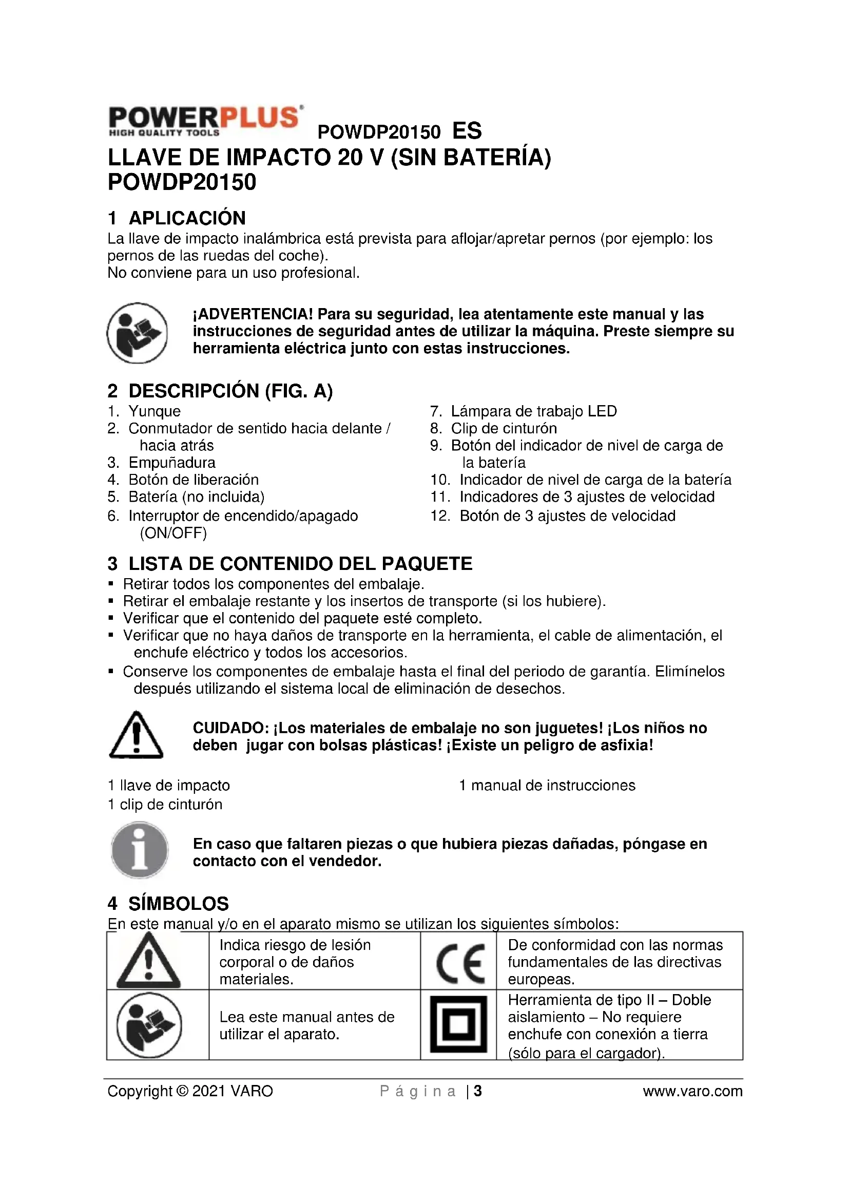 Herramienta de tipo II – Doble aislamiento – No requiere enchufe con conexión a tierra (sólo para el cargador).POWDP20150 ES Copyright © 2021 VARO P á g i n a | 4 www.varo.com