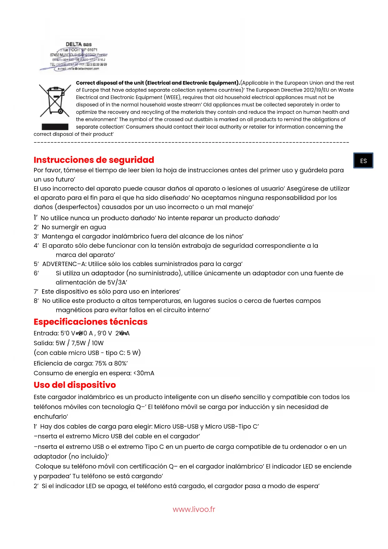 ESwww.livoo.fr Nota: Si el cargador se sobrecalienta, aleja el teléfono móvil del aparato. Deje que el transmisor se enfríe antes de intentar cargar el teléfono móvil. Limpieza y mantenimiento Limpia el cable con un paño seco. Si no lo utilizas, guárdalo en un lugar seco y sin polvo. DECLARACIÓN DE CONFORMIDAD DE LA UE Nosotros DELTA BP61071 67452 Mundolsheim – France Declaramos bajo nuestra responsabilidad que el artículo : Descripción: - Carga rápida del cargador inalámbrico - Referencia: TEA302 al que se aplica esta declaración, es conforme a la legislación de armonización de la UE pertinente: DIRECTIVAS NORMAS o requisitos (ROHS) 2011/65/EU La finalidad de la declaración descrita anteriormente es conforme a la Directiva 2011/65/UE del Parlamento Europeo y del Consejo, de 8 de junio de 2011, sobre restricciones a la utilización de determinadas sustancias peligrosas en aparatos eléctricos y electrónicos. UE 2011/65/UE y UE 2015/863