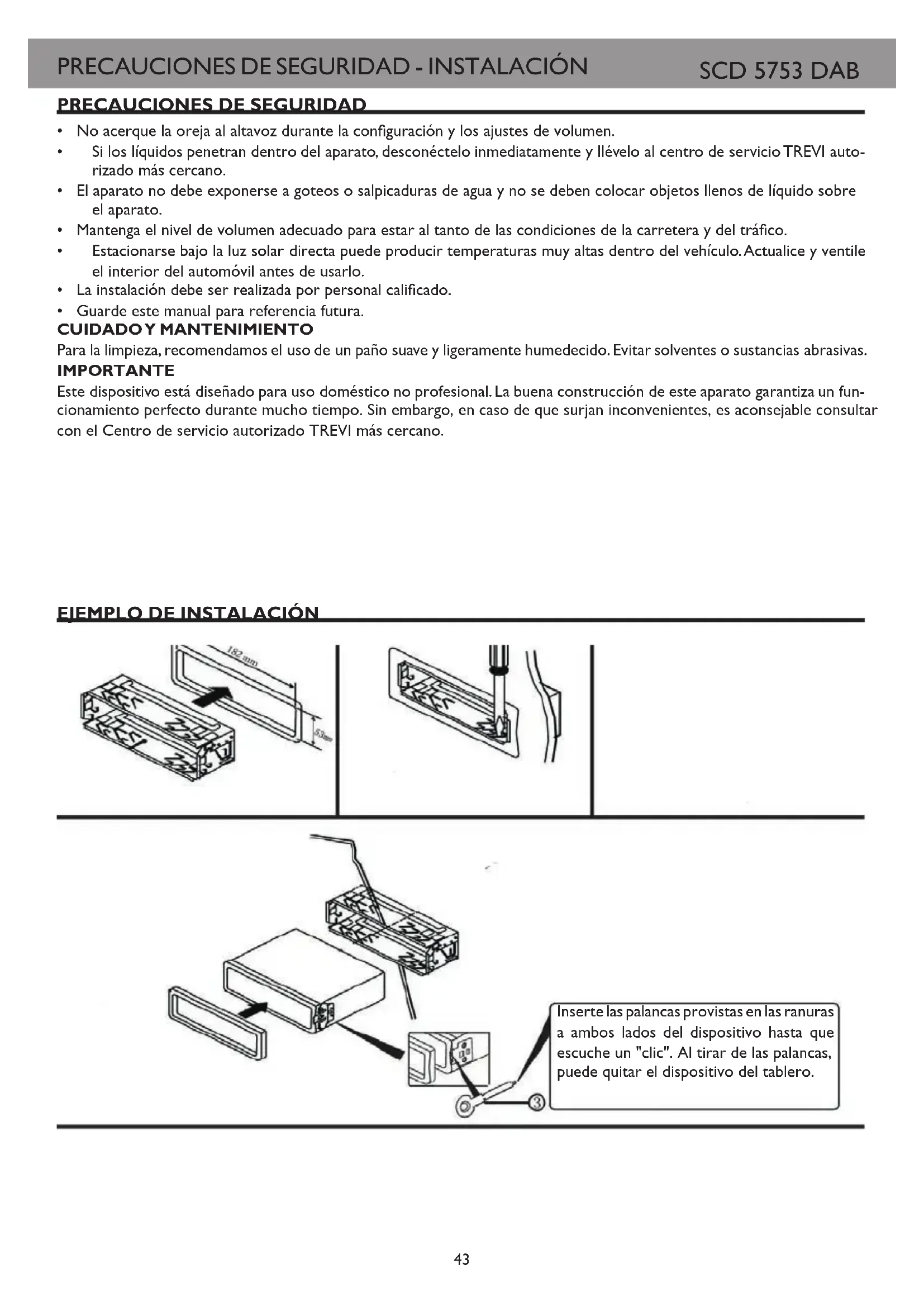 Para la limpieza, recomendamos el uso de un paño suave y ligeramente humedecido. Evitar solventes o sustancias abrasivas. IMPORTANTE Este dispositivo está diseñado para uso doméstico no profesional. La buena construcción de este aparato garantiza un fun- cionamiento perfecto durante mucho tiempo. Sin embargo, en caso de que surjan inconvenientes, es aconsejable consultar con el Centro de servicio autorizado TREVI más cercano. Inserte las palancas provistas en las ranuras a ambos lados del dispositivo hasta que escuche un "clic". Al tirar de las palancas, puede quitar el dispositivo del tablero.44 SCD 5753 DAB