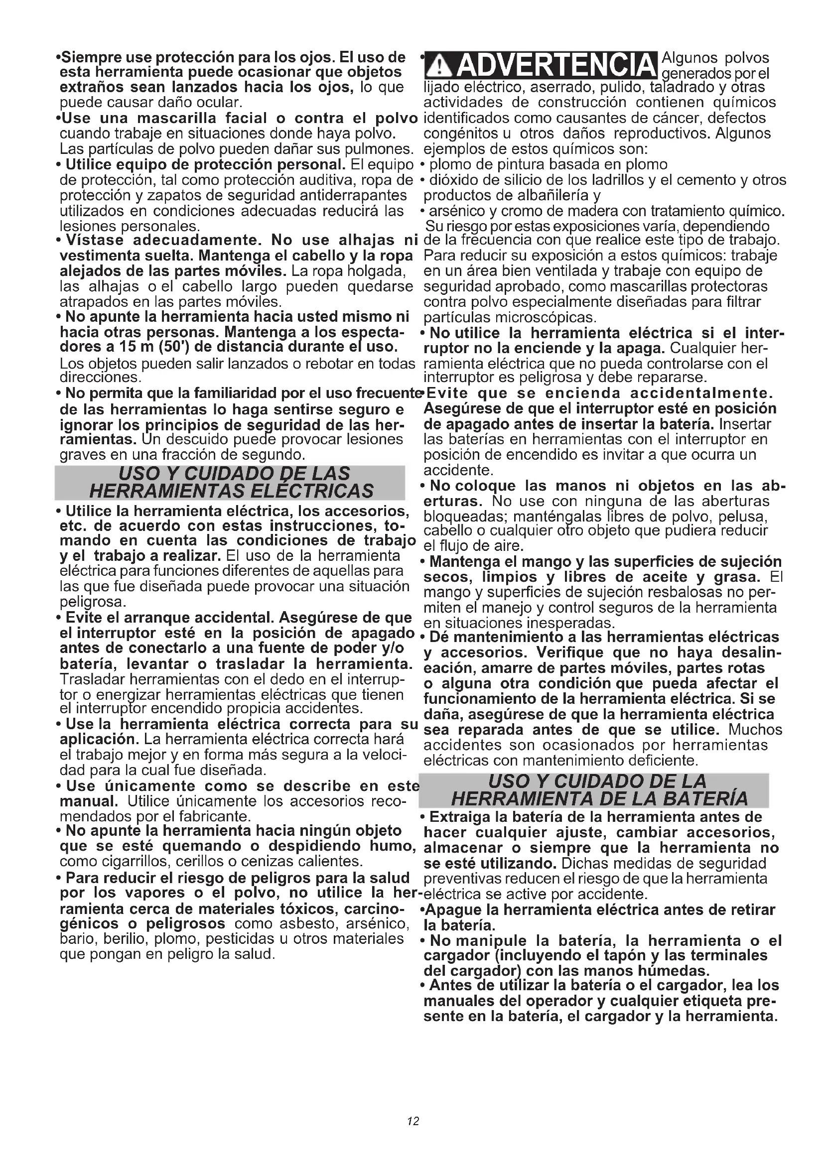 - Manténgase alerta, preste atención a lo que hace y use su sentido común cuando maneje cualquier herramienta eléctrica. No use una herramienta eléctrica si está cansado o bajo la inuencia de drogas, alcohol o medicamentos. Un momento de distracción mientras maneja cualquier herramienta eléctrica puede dar como resultado graves lesiones personales.12