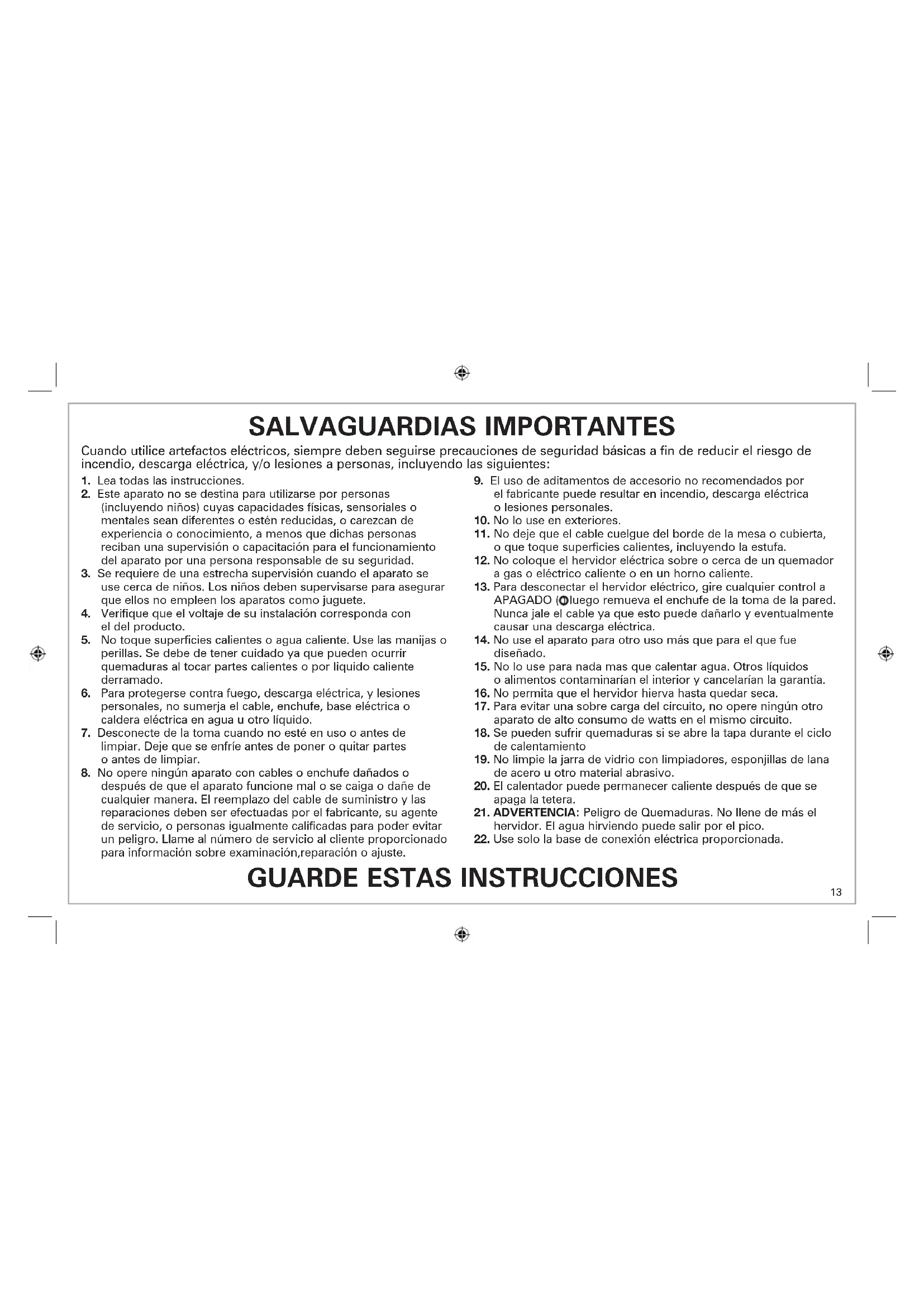 Para evitar la acumulación de depósitos de cal, vacíe la caldera después de cada uso. Limpie el exterior de la caldera con un trapo húmedo. w ADVERTENCIA Peligro de Quemaduras: No use estropajos o polvos abrasivos ya que pueden tallar la superficie suave de la caldera, lo que provocaría que el vidrio se rompiera de repente durante el uso o la limpieza. Para remover la decoloración de depósitos de cal del elemento calefactor: Coloque 1/2 cucharaditas de crema tártara (disponible en el pasillo de condimentos de la tienda de abarrotes) o 1 cucharada de vinagre blanco o jugo de limón en la jarra. Luego llene la caldera a la mitad con agua. Conecte, ENCIENDIDO (I), y haga hervir. APAGADO ( ), deje enfriar, y enjuague varias veces para limpiar el agua de la llave. Si se Decolora el Piso del Hervidor: Es normal que los elementos caloríficos de acero inoxidable se descoloren. Esto no afecta el desempeño del hervidor. No use estropajos o limpiadores abrasivos ya que esto puede dañar la superficie de acero inoxidable. Si el Hervidor Hierve hasta Secarse: El elemento calorífico está protegido por dos dispositivos de seguridad automáticos. Si su caldera es encendida accidentalmente sin estar llena de agua, o se deja hervir hasta secarse, el hervidor se apagará automáticamente. Usted debe: