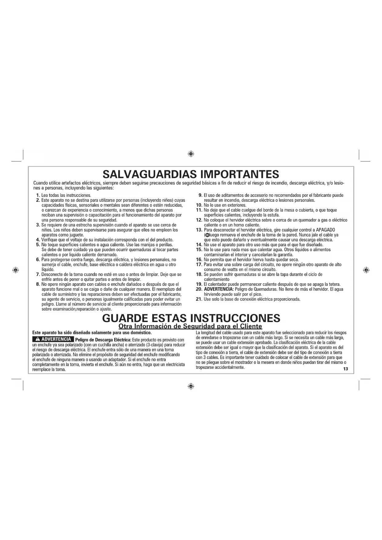 Cuidado y Limpieza w ADVERTENCIA Peligro de Descarga Eléctrica. No sumerja el hervidor, base eléctrica, o enchufe en agua o cualquier otro líquido. Para evitar la acumulación de depósitos de cal, vacíe la caldera después de cada uso. Limpie el exterior de la caldera con un trapo húmedo. No use estropajos o polvos abrasivos ya que pueden tallar la superficie suave de la caldera. Para remover la decoloración de depósitos de cal del elemento calefactor: Coloque 1/2 cucharaditas de crema tártara (disponible en el pasillo de condimentos de la tienda de abarrotes) en la caldera. Luego llene la caldera a la mitad con agua. Conecte, ENCIENDIDO (I), y haga hervir. APAGADO ( ), deje enfriar, y enjuague varias veces para limpiar el agua de la llave. Si se Decolora el Piso del Hervidor: Es normal que los elementos caloríficos de acero inoxidable se descoloren. Esto no afecta el desempeño del hervidor. No use estropajos o limpiadores abrasivos ya que esto puede dañar la superficie de acero inoxidable. Si el Hervidor Hierve hasta Secarse: El elemento calorífico está protegido por dos dispositivos de seguridad automáticos. Si sucaldera es encendida accidentalmente sin estar llena de agua, o se deja hervir hasta secarse, el hervidor se apagará automáticamente. Usted debe: