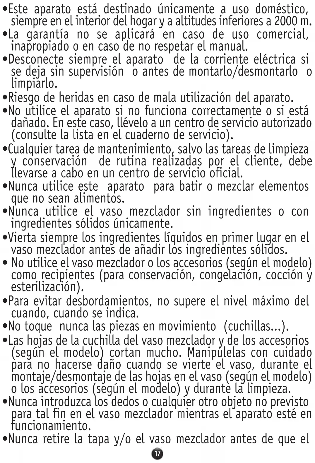 - Nunca introduzca los dedos o cualquier otro objeto no previsto para tal fin en el vaso mezclador mientras el aparato esté en funcionamiento.