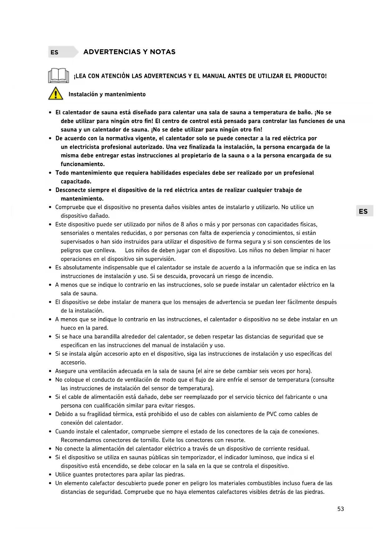CONTENIDO Estas instrucciones de instalación y uso están destinadas al propietario o a la perso-na a cargo de la sauna, así como al electricista en-cargado de la instalación eléctrica del calentador. Después de completar la instalación, la persona a cargo de la misma debe entregar estas instrucciones al propietario de la sauna o a la persona encargada de su funcionamiento.