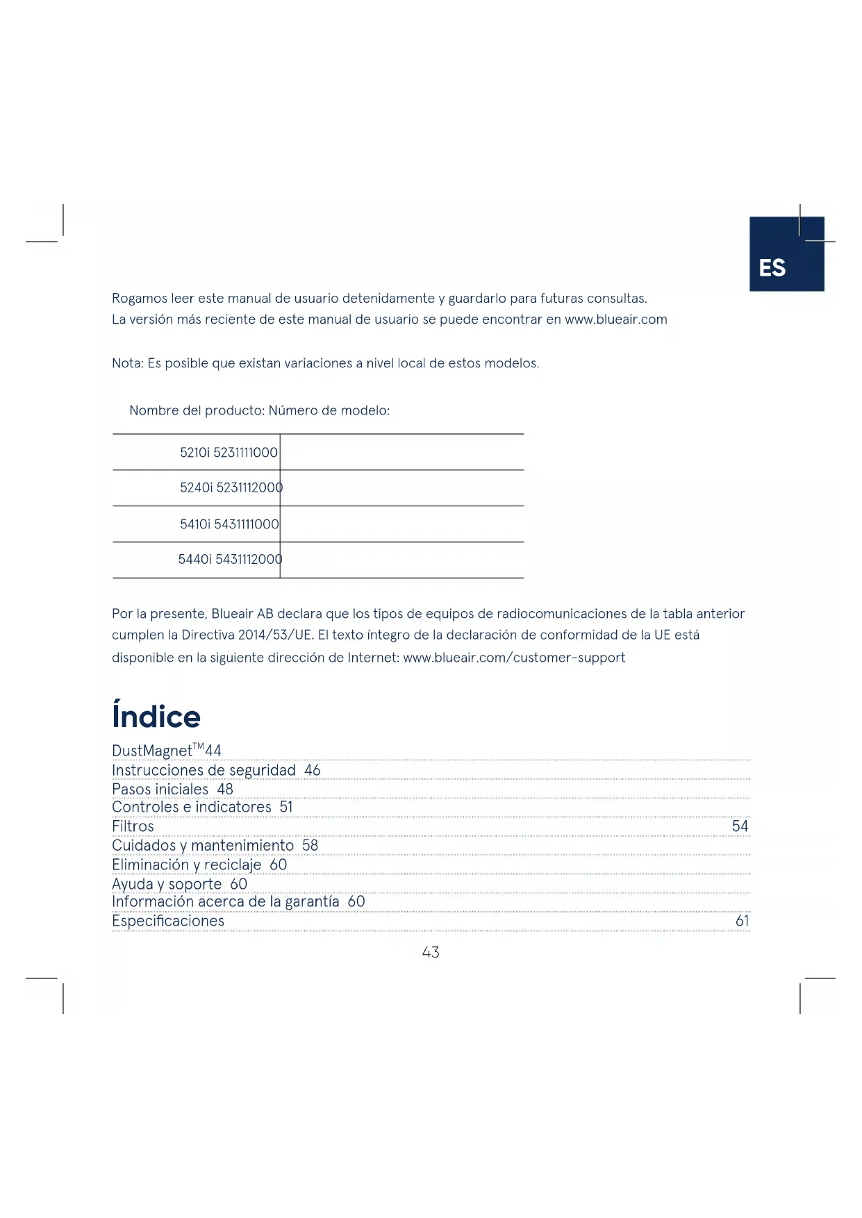 DustMagnet 44 Instrucciones de seguridad 46 Pasos iniciales 48 Controles e indicatores 51 Filtros 54 Cuidados y mantenimiento 58 Eliminación y reciclaje 60 Ayuda y soporte 60 Información acerca de la garantía 60 Especificaciones 61 Índice Rogamos leer este manual de usuario detenidamente y guardarlo para futuras consultas. La versión más reciente de este manual de usuario se puede encontrar en www.blueair.com Nota: Es posible que existan variaciones a nivel local de estos modelos. Nombre del producto: Número de modelo: 5210i 5231111000 5240i 5231112000 5410i 5431111000 5440i 5431112000 Por la presente, Blueair AB declara que los tipos de equipos de radiocomunicaciones de la tabla anterior cumplen la Directiva 2014/53/UE. El texto íntegro de la declaración de conformidad de la UE está disponible en la siguiente dirección de Internet: www.blueair.com/customer-support44 Blueair DustMagnet