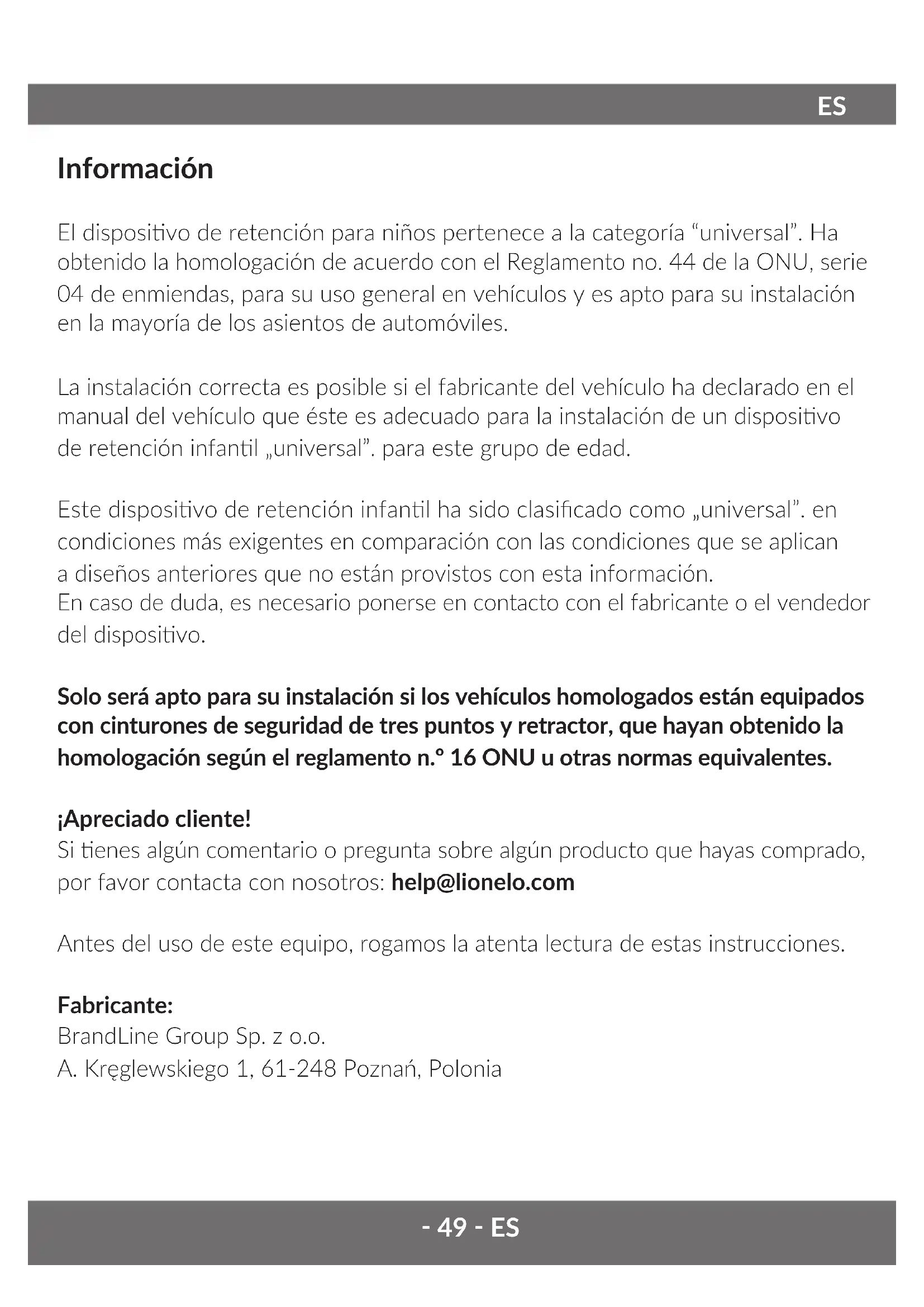 Información El disposivo de retención para niños pertenece a la categoría “universal”. Ha obtenido la homologación de acuerdo con el Reglamento no. 44 de la ONU, serie 04 de enmiendas, para su uso general en vehículos y es apto para su instalación en la mayoría de los asientos de automóviles. La instalación correcta es posible si el fabricante del vehículo ha declarado en el manual del vehículo que éste es adecuado para la instalación de un disposivo de retención infanl „universal”. para este grupo de edad. Este disposivo de retención infanl ha sido clasicado como „universal”. en condiciones más exigentes en comparación con las condiciones que se aplican a diseños anteriores que no están provistos con esta información. En caso de duda, es necesario ponerse en contacto con el fabricante o el vendedor del disposivo. Solo será apto para su instalación si los vehículos homologados están equipados con cinturones de seguridad de tres puntos y retractor, que hayan obtenido la homologación según el reglamento n.º 16 ONU u otras normas equivalentes. ¡Apreciado cliente! Si enes algún comentario o pregunta sobre algún producto que hayas comprado, por favor contacta con nosotros: help@lionelo.com Antes del uso de este equipo, rogamos la atenta lectura de estas instrucciones. Fabricante: BrandLine Group Sp. z o.o. A. Kręglewskiego 1, 61-248 Poznań, Polonia‑ 50 ‑ES Información importante Lea este manual de instrucciones antes de usarlo y guárdalo. Las instrucciones le ayudarán a instalar el asiento correctamente. Un montaje incorrecto puede poner en peligro la salud del niño. El fabricante no se hace responsable de los peligros causados por una instalación incorrecta del asiento. Esta silla está diseñada para los grupos de peso I, II y III, lo que signica que puede ser ulizada por niños con el pes comprendido entre 9 y 36 kg. I grupo de peso: 9-18 kg, II grupo de peso: 15-25 kg, III grupo de peso: 22-36 kg.