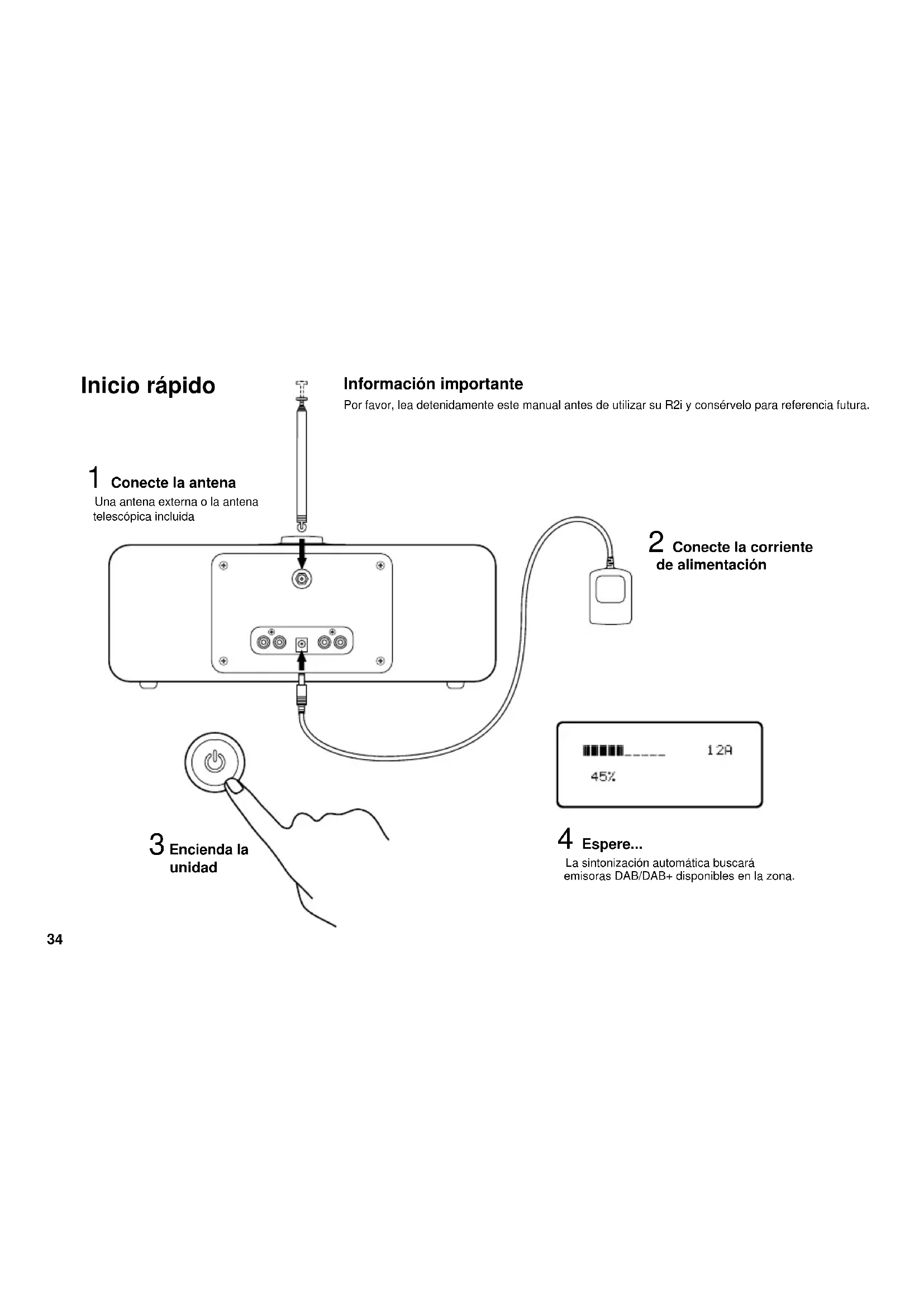 NL34 Inicio rápido Información importante Por favor, lea detenidamente este manual antes de utilizar su R2i y consérvelo para referencia futura. 1 Conecte la antena Una antena externa o la antena telescópica incluida 2 Conecte la corriente de alimentación 3 Encienda la unidad 4 Espere... La sintonización automática buscará emisoras DAB/DAB+ disponibles en la zona.35 5 Active el mando a distancia Quite la pestaña de plástico para activar la pila ... la radio DAB: pulse ▲▼ para recorrer las emisoras disponibles. OK para seleccionar la emisora. FM: mantenga pulsado ▲▼ para buscar la siguiente emisora disponible. ... reproductores de MP3 y otros dispositivos de audio Conecte la salida de audio analógico de un dispositivo de audio externo, como un reproductor de MP3, un ordenador portátil o un reproductor de CD a las entradas auxiliares en la parte delantera o trasera del R2i. 6 Escuche... Primero seleccione la fuente elegida ... el iPod Retire la cubierta y, si dispone de él, introduzca el adaptador de base dock universal correcto, que permitirá una alineación correcta y evitará tensiones en el conector. Si no tiene un adaptador de base dock para su modelo, puede adquirirlo directamente en Apple o en varios distribuidores autorizados. Es posible usar los modelos del iPod en el R2i sin usar un adaptador, pero debe tenerse cuidado al ponerlo y quitarlo. ES36 Audio Pulse AUDIO para recorrer los ajustes (3D Sound [sonido 3D], Loudness [volumen], EQ [ecualizador]) Las opciones editables parpadearán. Use las teclas ▲▼ para cambiar los ajustes. OK para confirmar. Clock (reloj) Pulse CLOCK para alternar entre Alarm (alarma), Sleep (apagado retardado) y Manual Clock Set (ajuste manual del reloj).Para ajustar la alarmaSeleccione Alarm, pulse OK: parpadeará ON/OFF. Use ▲▼ y OK para ajustar la hora de alarma, la fuente y el volumen. Una vez ajustada, la pantalla se apagará a los 5 segundos. en la pantalla indica que la alarma está activada.Para ajustar el apagado retardadoSeleccione Sleep, pulse OK. ON/OFF parpadeará. Use ▲▼ y OK para ajustar el temporizador. Una vez ajustado, la pantalla se apagará a los 5 segundos. Una ‘S’ indica que el temporizador está activado.Ajuste manual del relojUse esta función para ajustar la hora si está en una zona donde el R2i no pueda recibir automáticamente los datos de la hora a través de DAB o de FM con servicios RDS.Para ver los ajustes de alarma Pulse brevemente CLOCKActivar/desactivar la alarmaPulse brevemente CLOCK Mantenga pulsado OK Volumen : gire a izquierda o derecha. Snooze: púlselo cuando suene la alarma para repetirla cinco minutos después. Cancelar la alarma: mantener pulsado. Info (información) Pulse INFO para recorrer la información en pantalla. Modo DAB ● Datos del programa/artista/nombre de pista ● Potencia de la señal ● Banda y frecuencia ● Tipo de programa, como pop o música clásica ● Tipo de retransmisión y velocidad de datos ● Nombre Multiplex Modo FM ● Radiotexto: datos del programa ● Potencia de la señal ● Tipo de música, como pop o música clásica ● Modo de audio: Auto (estéreo)/Mono ● Nombre de emisora Source (fuente) Pulse SOURCE (la fuente actual parpadeará) y use las teclas ▲▼ para alternar entre DAB, FM, iPod, AUX1 y AUX2. Pulse OK para seleccionar. Controles básicos Presintonías De Radio Guarde 5 emisoras DAB y 5 FM Seleccione la emisora: pulse 1-5. Guarde la emisora: mantenga pulsado 1-5.37 Down (abajo) Navegación por el menú del iPod Shufe (reproducción aleatoria) Reproducción aleatoria de las pistas Controles de iPod Enter (intro) Navegación por el menú del iPod Up (arriba) Navegación por el menú del iPod Reproducir pista/pausa Apagar el iPod: mantener pulsado MENÚ Navegación por el menú del iPod Saltar pista/retroceso rápido Saltar pista/avance rápido Menú Navegación por el menú del iPod ES38 Reloj Alarma, apagado retardado y ajuste manual del reloj Mando a distancia Conozca su R2i Toma de auriculares de 3,5 mm Reposo Entrada de línea auxiliar Conecte una fuente externa, como un reproductor de MP3 Reposo Info Recorrer la información en pantalla Fuente Seleccionar emisora / funciones del iPod Funciones del iPod Presintonías 1-5 Cambiar la pila Extraiga el soporte de la pila Audio Sonido 3D, volumen, & ecualizador CR2025 Pila de litio Respete la polaridad Volumen Entrada de línea (L) (R) Conecte una fuente externa, como un reproductor de MP3 Salida de línea (L) (R) Conectar a un amplicador o sistema de grabación externo 12 V de CC, 2 A Conector del adaptador39 Otras funciones Emisoras secundarias Algunas emisoras DAB disponen de servicios secundarios. Esto se indica mediante el signo > después del nombre de la emisora. Pulse OK para alternar entre la emisora principal y un servicio secundario. Modo FM: Auto (estéreo)/Mono En el modo FM el R2i utilizará estéreo como ajuste predeterminado, aunque para emisoras poco potentes es posible reducir el ruido de fondo seleccionando Mono. Mantenga pulsado OK para cambiar entre Auto (estéreo) y Mono. Sintonía manual, sintonía automática y restablecimiento del sistema Mantenga pulsada la tecla INFO para alternar entre las subfunciones. Pulse OK para acceder a cada una. ● Sintonía manual (modo DAB) Si conoce el canal y la frecuencia de una emisora DAB, utilice esta función para acceder directamente a la emisora. ● Sintonía automática (modo DAB) Realiza una nueva exploración DAB y añadirá las emisoras nuevas que estén disponibles. ● Restablecimiento del sistema (modos DAB y FM) Restablece el R2i a los ajustes predeterminados de fábrica e inicia una nueva exploración de emisoras DAB. Si se mueve a otro lugar es posible que cambien los servicios DAB que recibe. Al realizar un restablecimiento del sistema, se borrarán las emisoras que ya no estén disponibles y se sustituirán por las que sí lo estén. Precauciones ● Utilizar los auriculares con un volumen elevado pu