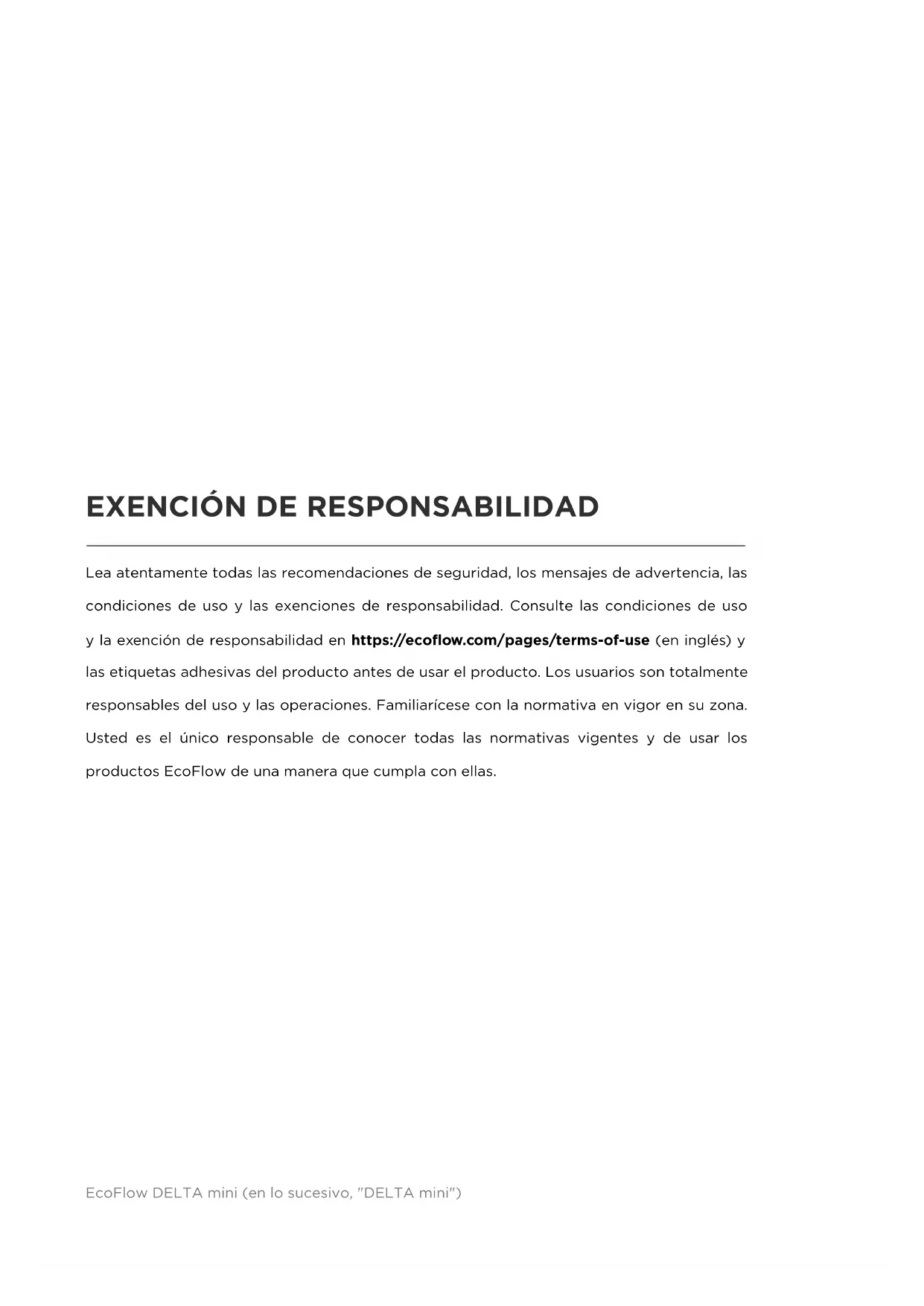 "deep sleep". In tal caso, caricare il prodotto prima di riutilizzarlo.EcoFlow DELTA mini Manual de usuarioEcoFlow DELTA mini Manual de usuario Lea atentamente todas las recomendaciones de seguridad, los mensajes de advertencia, las condiciones de uso y las exenciones de responsabilidad. Consulte las condiciones de uso y la exención de responsabilidad en https://ecoflow.com/pages/terms-of-use (en inglés) y las etiquetas adhesivas del producto antes de usar el producto. Los usuarios son totalmente responsables del uso y las operaciones. Familiarícese con la normativa en vigor en su zona. Usted es el único responsable de conocer todas las normativas vigentes y de usar los productos EcoFlow de una manera que cumpla con ellas.