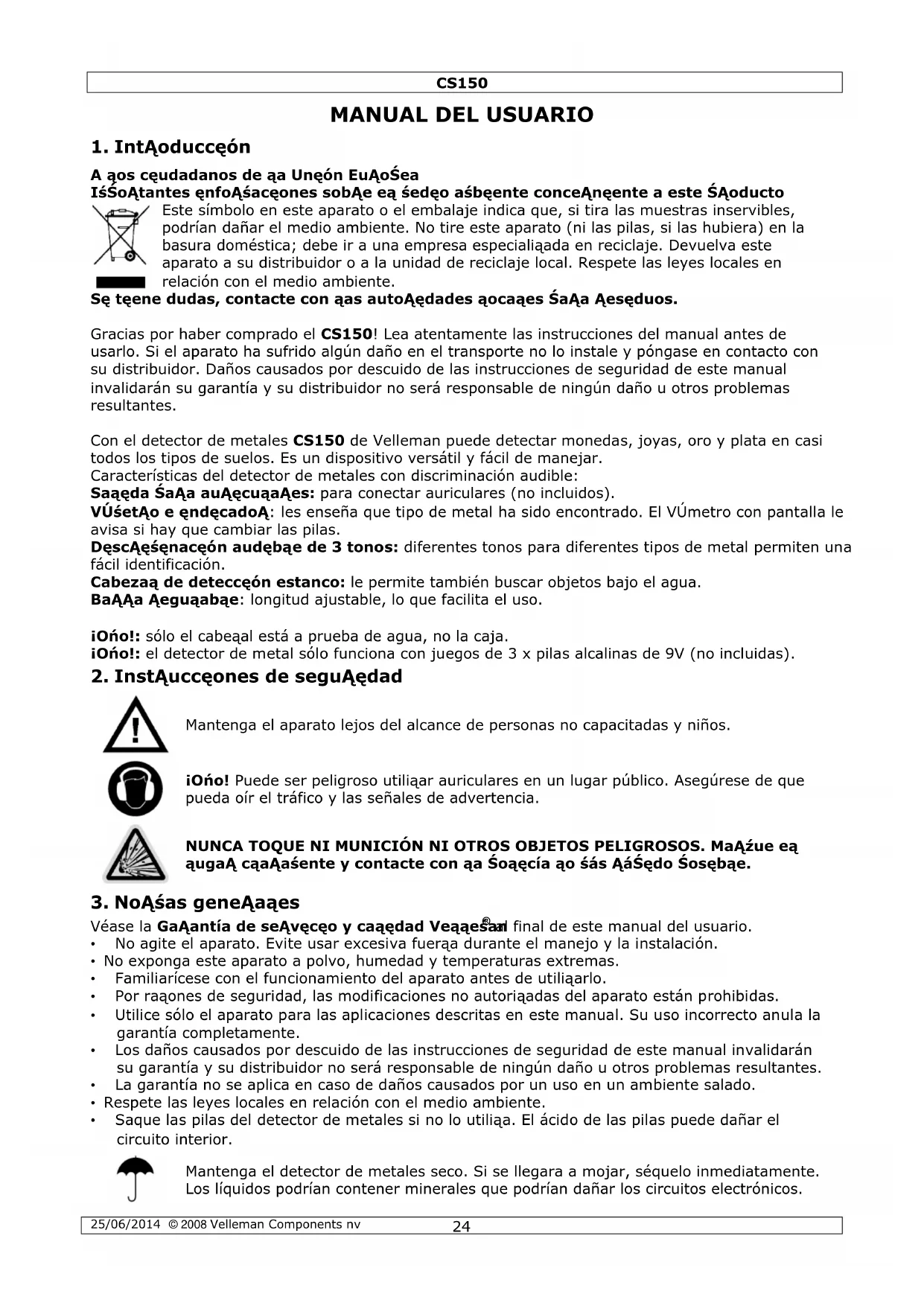 Mantenga el detector de metales seco. Si se llegara a mojar, séquelo inmediatamente. Los líquidos podrían contener minerales que podrían dañar los circuitos electrónicos.CS150 25/06/2014 © 2008 Velleman Components nv