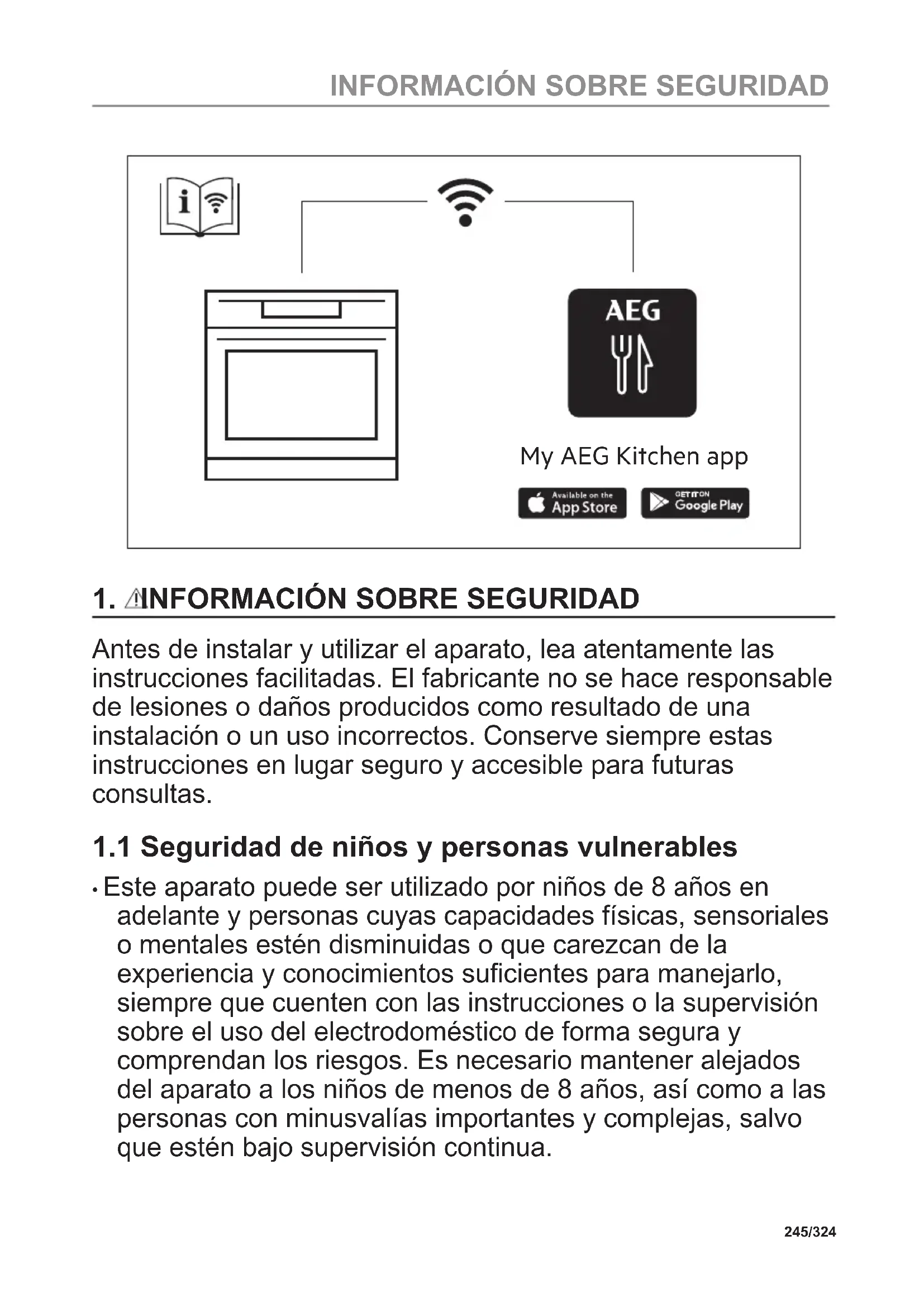 - Este aparato puede ser utilizado por niños de 8 años en adelante y personas cuyas capacidades físicas, sensoriales o mentales estén disminuidas o que carezcan de la experiencia y conocimientos suficientes para manejarlo, siempre que cuenten con las instrucciones o la supervisión sobre el uso del electrodoméstico de forma segura y comprendan los riesgos. Es necesario mantener alejados del aparato a los niños de menos de 8 años, así como a las personas con minusvalías importantes y complejas, salvo que estén bajo supervisión continua. 245/324 INFORMACIÓN SOBRE SEGURIDAD• Es necesario vigilar a los niños para que no jueguen con el aparato y dispositivos móviles con My AEG Kitchen .