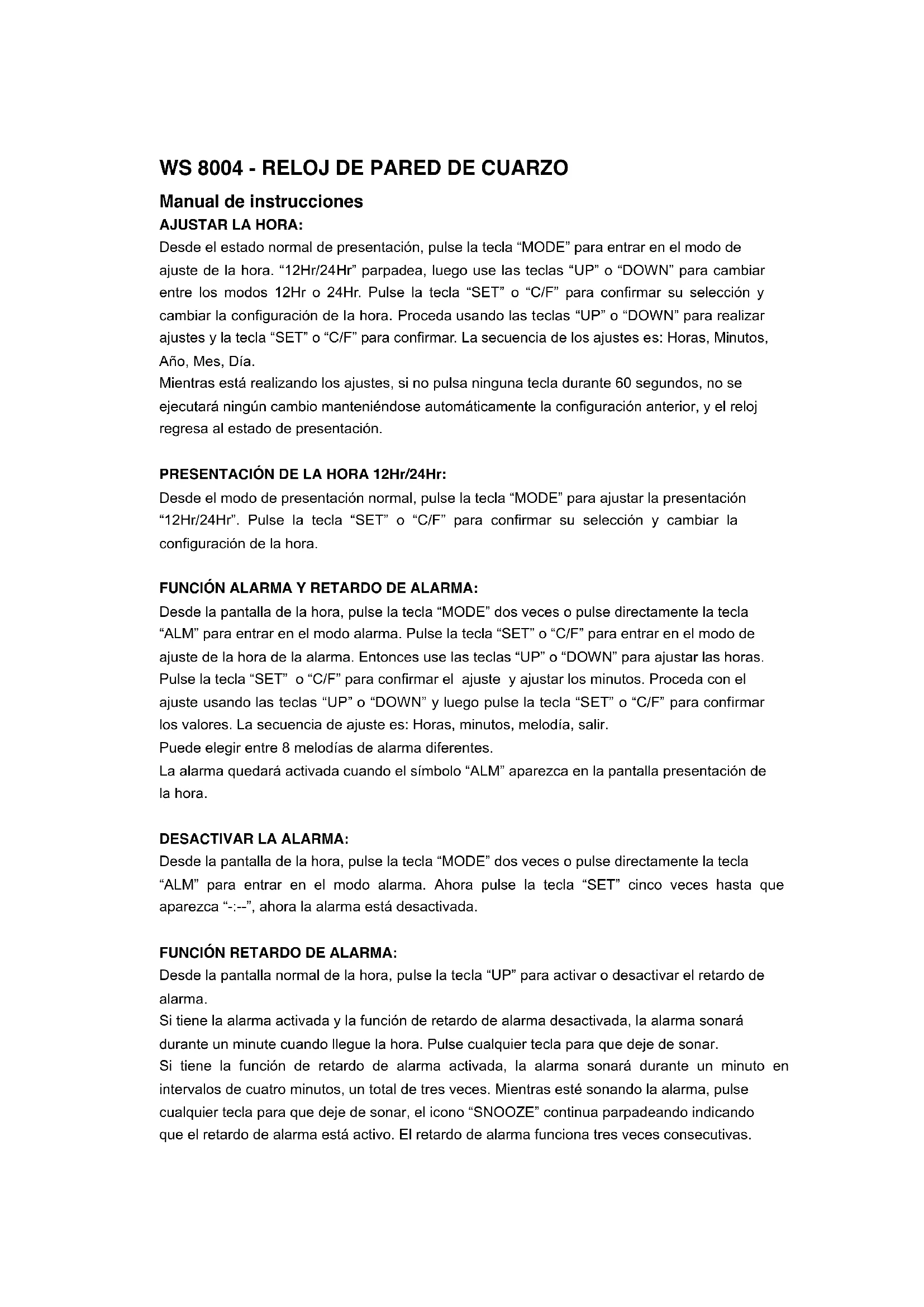 Séparez le carton d’emballage de tout sous carton éventuel en plastique. Tout bien trier conformément aux règlementations en matière de séparation des déchets.WS 8004 - RELOJ DE PARED DE CUARZO Manual de instrucciones AJUSTAR LA HORA: Desde el estado normal de presentación, pulse la tecla “MODE” para entrar en el modo de ajuste de la hora. “12Hr/24Hr” parpadea, luego use las teclas “UP” o “DOWN” para cambiar entre los modos 12Hr o 24Hr. Pulse la tecla “SET” o “C/F” para confirmar su selección y cambiar la configuración de la hora. Proceda usando las teclas “UP” o “DOWN” para realizar ajustes y la tecla “SET” o “C/F” para confirmar. La secuencia de los ajustes es: Horas, Minutos, Año, Mes, Día. Mientras está realizando los ajustes, si no pulsa ninguna tecla durante 60 segundos, no se ejecutará ningún cambio manteniéndose automáticamente la configuración anterior, y el reloj regresa al estado de presentación. PRESENTACIÓN DE LA HORA 12Hr/24Hr: Desde el modo de presentación normal, pulse la tecla “MODE” para ajustar la presentación “12Hr/24Hr”. Pulse la tecla “SET” o “C/F” para confirmar su selección y cambiar la configuración de la hora. FUNCIÓN ALARMA Y RETARDO DE ALARMA: Desde la pantalla de la hora, pulse la tecla “MODE” dos veces o pulse directamente la tecla “ALM” para entrar en el modo alarma. Pulse la tecla “SET” o “C/F” para entrar en el modo de ajuste de la hora de la alarma. Entonces use las teclas “UP” o “DOWN” para ajustar las horas. Pulse la tecla “SET” o “C/F” para confirmar el ajuste y ajustar los minutos. Proceda con el ajuste usando las teclas “UP” o “DOWN” y luego pulse la tecla “SET” o “C/F” para confirmar los valores. La secuencia de ajuste es: Horas, minutos, melodía, salir. Puede elegir entre 8 melodías de alarma diferentes. La alarma quedará activada cuando el símbolo “ALM” aparezca en la pantalla presentación de la hora. DESACTIVAR LA ALARMA: Desde la pantalla de la hora, pulse la tecla “MODE” dos veces o pulse directamente la tecla “ALM” para entrar en el modo alarma. Ahora pulse la tecla “SET” cinco veces hasta que aparezca “-:--”, ahora la alarma está desactivada. FUNCIÓN RETARDO DE ALARMA: Desde la pantalla normal de la hora, pulse la tecla “UP” para activar o desactivar el retardo de alarma. Si tiene la alarma activada y la función de retardo de alarma desactivada, la alarma sonará durante un minute cuando llegue la hora. Pulse cualquier tecla para que deje de sonar. Si tiene la función de retardo de alarma activada, la alarma sonará durante un minuto en intervalos de cuatro minutos, un total de tres veces. Mientras esté sonando la alarma, pulse cualquier tecla para que deje de sonar, el icono “SNOOZE” continua parpadeando indicando que el retardo de alarma está activo. El retardo de alarma funciona tres veces consecutivas.Pulse la tecla “UP” para desactivar el retardo de alarma. CONFIGURAR RECORDATORIO-CUMPLEAÑOS: Desde el estado de presentación normal, pulse la tecla “MODE” tres veces para entrar en el modo de recordatorio-cumpleaños. Pulse la tecla “SET” o “C/F” para entrar en el modo de configuración de recordatorio-cumpleaños. Entonces use las teclas “UP” o “DOWN” para ajustar las horas. Pulse la tecla “SET” o “C/F” para confirmar los cambios y ajustar los minutos. Continúe con los ajustes usando las teclas “UP” o “DOWN” para ajustar y la tecla “SET” o “C/F” para confirmar los ajustes realizados. La secuencia de los ajustes es: Horas, minutos, año, mes, día, salir. Cuando se alcance el día y la hora establecidos, el reloj hará sonar la canción de cumpleaños feliz durante 5 minutos para celebrar el cumpleaños. Si no desea usar la función de recordatorio, establezca una fecha ya pasada. Mientras está realizando los ajustes, si no pulsa ninguna tecla durante 60 segundos, no se ejecutará ningún cambio manteniéndose automáticamente la configuración anterior, y el reloj regresa al estado de presentación. CONFIGURAR EL TEMPORIZADOR: Desde el estado de presentación normal, pulse la tecla “MODE” cuatro veces para entrar en el modo temporizador. Pulse la tecla “SET” o “C/F” para entrar en el modo de ajuste de la alarma. Entonces use las teclas “UP” o “DOWN” para ajustar las horas. Pulse la tecla “SET” o “C/F” para confirmar los cambios y ajustar los minutos. Continúe ajustando los minutos usando las teclas “UP” o “DOWN” y la tecla “SET” o “C/F” para confirmar los ajustes realizados. El margen del temporizador es Horas, Minutos (aproximadamente 23 Hr: 59 Min). Tras confirmar la selección de los minutes, el temporizador empezará la cuenta atrás. Usted puede parar y reiniciar la cuenta atrás pulsando la tecla “SET” mientras tenga el modo temporizador en pantalla. Cuando el temporizador llegue a 0:00:00, la alarma sonará durante 1 minuto, y “0:00:00” parpadeará al mismo tiempo. Mientras está realizando los ajustes, si no pulsa ninguna tecla durante 60 segundos, no se ejecutará ningún cambio manteniéndose automáticamente la configuración anterior, y el reloj regresa al estado de presentación. DESACTIVAR EL TEMPORIZADOR: Desde el estado de presentación normal, pulse la tecla “MODE” cuatro veces para entrar en el modo temporizador. Ahora pulse la tecla “SET” cuatro veces hasta que aparezca “-:--”, y el temporizador quedará desactivado. PRESENTACIÓN DE LA TEMPERATURA °C/°F: Desde el estado de presentación normal, Pulse la tecla “SET” o “C/F” para cambiar de unidades entre °C y °F. OÍR LAS MELODÍAS:Desde la pantalla de la hora normal, pulse la tecla “DOWN” para activar desactivar la marca de música “(((。)))”. Con la marca activada, las melodía sonará una tras otra hasta que se desactive pulsando la tecla “DOWN”. Declaración d