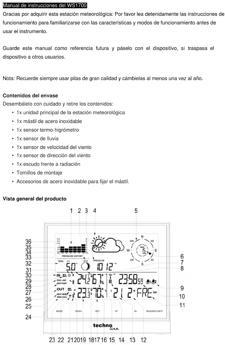WS 1700 - Estación meteorológica TECHNOLINE - Manual de uso y guía de instrucciones gratis