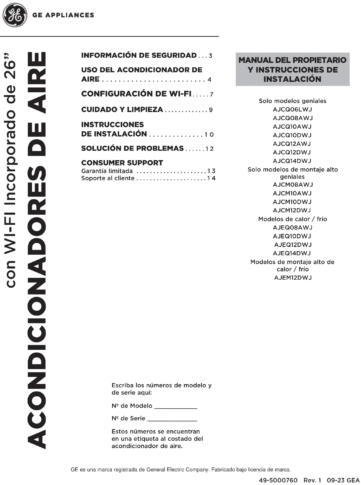 INSTALACIÓN Solo modelos geniales AJCQ06LWJ AJCQ08AWJ AJCQ10AWJ AJCQ10DWJ AJCQ12AWJ AJCQ12DWJ AJCQ14DWJ Solo modelos de montaje alto geniales AJCM08AWJ AJCM10AWJ AJCM10DWJ AJCM12DWJ Modelos de calor / frío AJEQ08AWJ AJEQ10DWJ AJEQ12DWJ AJEQ14DWJ Modelos de montaje alto de calor / frío AJEM12DWJ2 49-5000760 Rev. 1 GRACIAS POR HACER QUE GE APPLIANCES SEA PARTE DE SU HOGAR. Ya sea que haya crecido usando GE Appliances, o que ésta es su primera vez, nos complace tenerlo en la familia. Sentimos orgullo por el nivel de arte, innovación y diseño de cada uno de los electrodomésticos de GE Appliances, y creemos que usted también. Entre otras cosas, el registro de su electrodoméstico asegura que podamos entregarle información importante del producto y detalles de la garantía cuando los necesite. Registre su electrodoméstico GE ahora a través de Internet. Sitios Web y números telefónicos útiles están disponibles en la sección de Soporte para el Consumidor de este Manual del Propietario.49-5000760 Rev. 1 3 Para obtener información sobre el reciclaje de electrodomésticos, visite GEAppliances.com/recycling.
