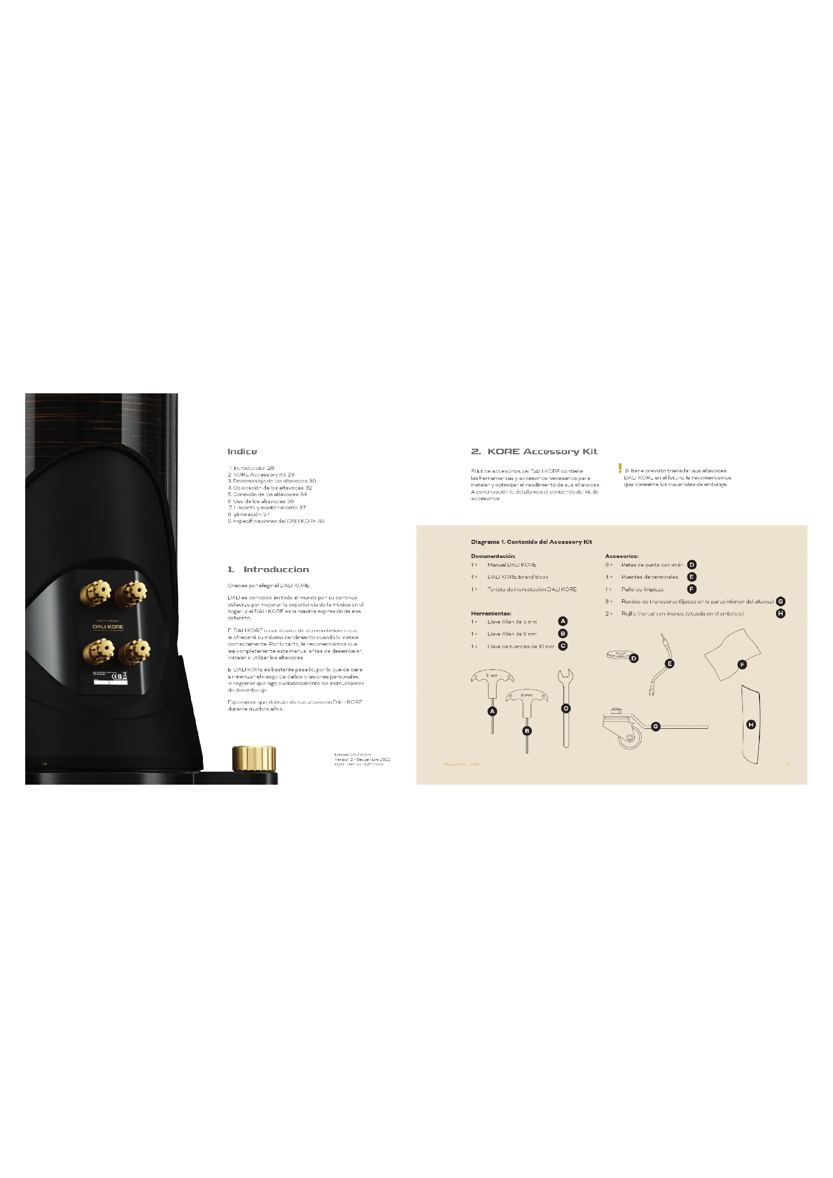 MANUAL ES1. Introduccion Gracias por elegir el DALI KORE. DALI es conocido en todo el mundo por su continuo esfuerzo por mejorar la experiencia de la música en el hogar, y el DALI KORE es la máxima expresión de ese esfuerzo. El DALI KORE es un altavoz de alto rendimiento que le ofrecerá su máximo rendimiento cuando lo instale correctamente. Por lo tanto, le recomendamos que lea completamente este manual antes de desembalar, instalar o utilizar los altavoces. El DALI KORE es bastante pesado, por lo que de cara a minimizar el riesgo de daños o lesiones personales, le rogamos que siga cuidadosamente las instrucciones de desembalaje. Esperamos que disfrute de sus altavoces DALI KORE durante muchos años. Indice