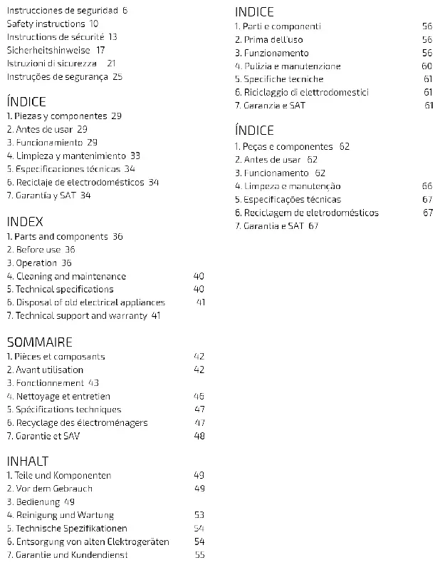 Lea las siguientes instrucciones atentamente antes de usar el producto. Guarde este manual para referencias futuras o nuevos usuarios. Asegúrese de que el voltaje de red coincida con el voltaje especificado en la etiqueta de clasificación del producto y de que el enchufe tenga toma de tierra. No sumerja el cable, el enchufe o cualquier otra parte fija del producto en agua o cualquier otro líquido. No exponga las conexiones eléctricas al agua. Asegúrese de que tiene las manos completamente secas antes de tocar el enchufe o encender el producto. Si el producto cae accidentalmente en agua, desconéctelo inmediatamente. ¡No toque el agua! No retuerza, doble, estire o dañe el cable de alimentación. Protéjalo de bordes afilados y fuentes de calor. No permita que el cable toque superficies calientes. No deje que el cable asome sobre el borde de la superficie de trabajo o la encimera. El aparato no está previsto para su operación por medio de un temporizador externo o un sistema de control remoto separado. Apague y desenchufe el producto de la fuente de alimentación cuando esté siendo usado y antes de limpiarlo. Tire del enchufe para desconectarlo; no tire del cable. Este producto está diseñado para planchar textiles. Este producto está diseñado exclusivamente para uso doméstico. No es apropiado para usos comerciales o industriales. No lo use en exteriores. Para evitar quemaduras o lesiones, no planche la ropa mientras la lleva puesta. No use accesorios que no hayan sido recomendados por el fabricante, ya que podrían causar lesiones o daños. Inspeccione el cable de alimentación regularmente en busca de daños visibles. Si el cable presenta daños, debe ser reparado por el Servicio de Asistencia Técnica oficial de Cecotec para evitar cualquier tipo de peligro. Este aparato puede ser usado por personas con capacidades físicas, sensoriales o mentales reducidas, o con falta de experiencia y conocimiento si están supervisados o han recibido instrucción concerniente al uso del aparato de una forma segura y entienden los riesgos que este implica. Sitúe el producto en una superficie seca, estable, plana y resistente al calor. La temperatura de las superficies accesibles podría ser alta mientras se usa el producto y podría causar quemaduras. No toque las superficies calientes mientras esté en funcionamiento e inmediatamente después. Desenchufe el producto inmediatamente si observa fuego o humo. No deje el producto sin supervisión mientras esté en uso. Desenchúfelo de la fuente de alimentación cuando acabe de usarlo o cuando abandone la habitación. El producto no debe estar conectado cuando llene o vacíe el depósito de agua. El tapón del depósito de agua no debe estar abierto cuando la plancha esté encendida. Se recomienda el uso de agua del grifo. Si el contenido de cal del agua del grifo es demasiado alto, realice una mezcla con un 50 % de agua del grifo y un 50 % de agua con mineralización débil. No use únicamente agua con mineralización débil. Las piezas metálicas calientes, el agua caliente o el vapor pueden producir quemaduras. Puede haber fugas de agua caliente. Tenga cuidado cuando llene el depósito o vuelque la plancha.Para evitar quemaduras o lesiones, no dirija el vapor hacia personas o animales al planchar. La plancha debe usarse en superficies estables. Cuando coloque la plancha sobre su base, asegúrese de que la superficie es estable. Mantener la plancha a máxima temperatura durante mucho tiempo podría causar una decoloración de la misma que no afectará a su funcionamiento. No intente reparar el producto por sí mismo. Contacte con el Servicio de Asistencia Técnica oficial de Cecotec. La limpieza y el mantenimiento del producto ha de realizarse de acuerdo con este manual de instrucciones, para asegurar el correcto funcionamiento del mismo. Apague y desenchufe el producto antes de moverlo o limpiarlo. Deje que se enfríe completamente antes de limpiarlo o guardarlo. Guarde el producto y su manual de instrucciones en un lugar seco y seguro cuando no vaya a ser usado. El fabricante no acepta ninguna responsabilidad sobre daños o lesiones que tengan como origen un uso inadecuado del producto. Todo uso incorrecto o incumplimiento de este manual anula la garantía del producto y las responsabilidades del fabricante. El aparato no debe ser usado por niños/as desde 0 hasta 8 años. Este aparato puede ser usado por niños/as de 8 años de edad y mayores de 8 años si están continuamente supervisados. Supervise a los niños/as para asegurarse de que no jueguen con el producto. Es necesario dar una supervisión estricta si la plancha está siendo usada por o cerca de niños/as. Mantenga el aparato y su cable fuera del alcance de los niños/ as de edad inferior a 8 años. La limpieza y el mantenimiento de usuario no deben ser realizados por niños/as. Advertencia: toda nuestra gama de planchas pasa un control de calidad antes de ser comercializados. En dichas pruebas se realiza un llenado del depósito de agua donde se comprueba la estanqueidad y el correcto funcionamiento del equipo. Una vez realizada la prueba se procede al vaciado y secado del depósito, pero puede quedar algún resto de agua en su interior.SAFETY INSTRUCTIONS Read these instructions thoroughly before using the appliance. Keep this instruction manual for future reference or new users. Make sure that the mains voltage matches the voltage stated on the rating label of the appliance and that the wall outlet is grounded. Do not immerse the cord, plug, or any non-removable part of the appliance in water or any other liquid. nor expose the electrical connections to water. Make sure your hands are dry before handling the plug or switching on the appliance. Never immerse the appliance in water. Do not reach into the water! Do not twist, bend, strain, or damage the power cord in any way. Protect it from sharp edges and heat sources. Do not let it touch hot surfaces. Do not let the cord h