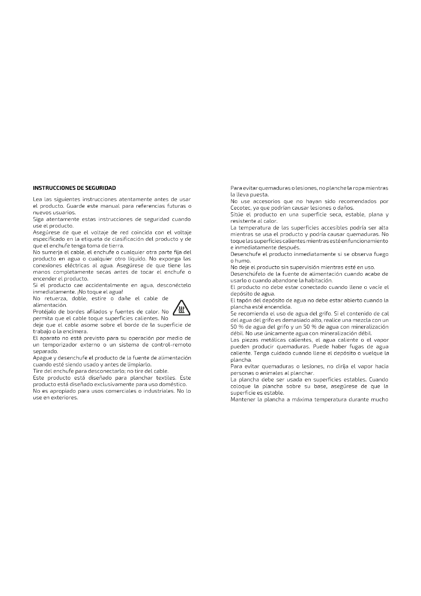 Lea las siguientes instrucciones atentamente antes de usar el producto. Guarde este manual para referencias futuras o nuevos usuarios. Siga atentamente estas instrucciones de seguridad cuando use el producto. Asegúrese de que el voltaje de red coincida con el voltaje especificado en la etiqueta de clasificación del producto y de que el enchufe tenga toma de tierra. No sumerja el cable, el enchufe o cualquier otra parte fija del producto en agua o cualquier otro líquido. No exponga las conexiones eléctricas al agua. Asegúrese de que tiene las manos completamente secas antes de tocar el enchufe o encender el producto. Si el producto cae accidentalmente en agua, desconéctelo inmediatamente. ¡No toque el agua! No retuerza, doble, estire o dañe el cable de alimentación. Protéjalo de bordes afilados y fuentes de calor. No permita que el cable toque superficies calientes. No deje que el cable asome sobre el borde de la superficie de trabajo o la encimera. El aparato no está previsto para su operación por medio de un temporizador externo o un sistema de control-remoto separado. Apague y desenchufe el producto de la fuente de alimentación cuando esté siendo usado y antes de limpiarlo. Tire del enchufe para desconectarlo; no tire del cable. Este producto está diseñado para planchar textiles. Este producto está diseñado exclusivamente para uso doméstico. No es apropiado para usos comerciales o industriales. No lo use en exteriores. Para evitar quemaduras o lesiones, no planche la ropa mientras la lleva puesta. No use accesorios que no hayan sido recomendados por Cecotec, ya que podrían causar lesiones o daños. Sitúe el producto en una superficie seca, estable, plana y resistente al calor. La temperatura de las superficies accesibles podría ser alta mientras se usa el producto y podría causar quemaduras. No toque las superficies calientes mientras esté en funcionamiento e inmediatamente después. Desenchufe el producto inmediatamente si se observa fuego o humo. No deje el producto sin supervisión mientras esté en uso. Desenchúfelo de la fuente de alimentación cuando acabe de usarlo o cuando abandone la habitación. El producto no debe estar conectado cuando llene o vacíe el depósito de agua. El tapón del depósito de agua no debe estar abierto cuando la plancha esté encendida. Se recomienda el uso de agua del grifo. Si el contenido de cal del agua del grifo es demasiado alto, realice una mezcla con un 50 % de agua del grifo y un 50 % de agua con mineralización débil. No use únicamente agua con mineralización débil. Las piezas metálicas calientes, el agua caliente o el vapor pueden producir quemaduras. Puede haber fugas de agua caliente. Tenga cuidado cuando llene el depósito o vuelque la plancha. Para evitar quemaduras o lesiones, no dirija el vapor hacia personas o animales al planchar. La plancha debe ser usada en superficies estables. Cuando coloque la plancha sobre su base, asegúrese de que la superficie es estable. Mantener la plancha a máxima temperatura durante muchotiempo podría causar una decoloración de esta que no afectará a su funcionamiento. No intente reparar el producto por sí mismo. Contacte con el Servicio de Asistencia Técnica oficial de Cecotec. La limpieza y el mantenimiento del producto ha de realizarse de acuerdo con este manual de instrucciones, para asegurar el correcto funcionamiento de este. Apague y desenchufe el producto antes de moverlo o limpiarlo. Deje que se enfríe completamente antes de limpiarlo o guardarlo. La limpieza y el mantenimiento de usuario no deben ser realizados por niños. Guarde el producto y su manual de instrucciones en un lugar seco y seguro cuando no vaya a ser usado. Cecotec no acepta ninguna responsabilidad sobre daños o lesiones que tengan como origen un uso inadecuado del producto. Todo uso incorrecto o incumplimiento de este manual anula la garantía del producto y las responsabilidades del fabricante. Si el cable de alimentación está dañado, debe ser sustituido por Cecotec, por su servicio posventa o por personal cualificado similar con el fin de evitar un peligro. El aparato no debe ser usado por niños desde 0 hasta 8 años. Este aparato puede ser usado por niños de 8 años y mayores de 8 años si están continuamente supervisados. Este aparato puede ser usado por personas con capacidades físicas, sensoriales o mentales reducidas, o con falta de experiencia y conocimiento si están supervisados o han recibido instrucción concerniente al uso del aparato de una forma segura y entienden los riesgos que este implica. Supervise a los niños para asegurarse de que no jueguen con el producto. Es necesario dar una supervisión estricta si la plancha está siendo usada por o cerca de niños. Mantenga el aparato y su cable fuera del alcance de los niños de edad inferior a 8 años. Advertencia: toda nuestra gama de planchas pasa un control de calidad antes de ser comercializados. En dichas pruebas se realiza un llenado del depósito de agua donde se comprueba la estanqueidad y el correcto funcionamiento del equipo. Una vez realizada la prueba se procede al vaciado y secado del depósito, pero puede quedar algún resto de agua en su interior.SAFETY INSTRUCTIONS Read these instructions thoroughly before using the appliance. Keep this instruction manual for future reference or new users. All safety instructions should be closely followed when using the appliance. Make sure that the mains voltage matches the voltage stated on the rating label of the appliance and that the wall outlet is grounded. Do not immerse the cord, plug, or any non-removable part of the appliance in water or any other liquid. nor expose the electrical connections to water. Make sure your hands are dry before handling the plug or switching on the appliance. Never immerse the appliance in water. Do not reach into the water! Do not twist, bend, strain, or damage the power cord in any way. Protect it from sharp edges and heat source