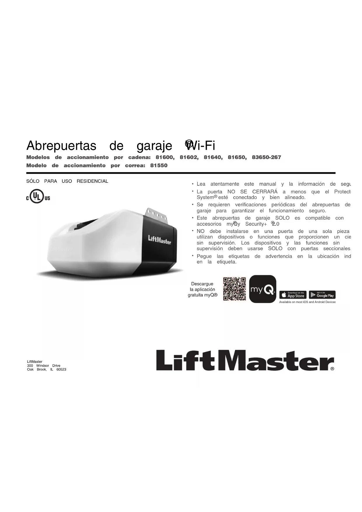 Pegue las etiquetas de advertencia en la ubicación indicada en la etiqueta. Available on most iOS and Android Devices Descargue la aplicación gratuita myQ® LiftMaster300 Windsor DriveOak Brook, IL 605232 Tabla de contenidos Preparación 3 Inventario en la caja: modelos 81600, 81602, 81640, 81650 y 83650-267 6 Inventario en la caja: modelo 81550 7 Conjunto 8 Modelos 81600, 81602, 81640*, 81650 y 83650-267 8 Modelo 81550 9 Instalación 10 Instale el control de la puerta 19 Instalación del sistema Protector System 22 Alimentación 26 Ajustes 29 Batería de respaldo 32 Funcionamiento 34 Mantenimiento 42 Resolución de problemas 43 Accesorios 45 Garantía 46 Guía de seguridad y mantenimiento del abrepuertas de garaje automático 47 Piezas de repuesto 49 Modelos 81600, 81602, 81640, 81650 y 83650-267 49 Modelos 81600 y 81602 50 Modelos 81640 y 81650 51 Model 83650-267 52 Modelo 81550 53 Modelo 81550 543 Preparación Número de serie del myQ