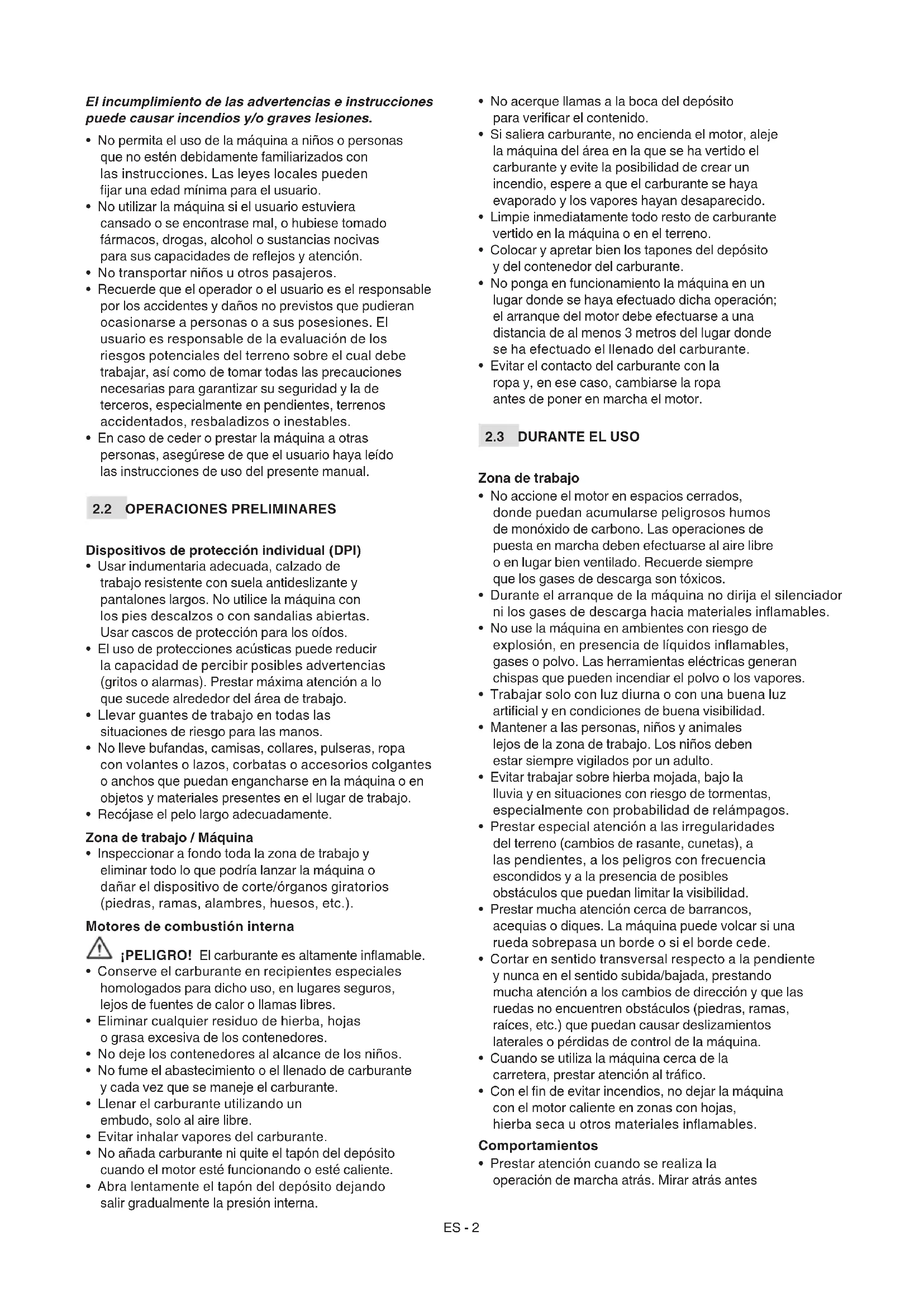 - Con el n de evitar incendios, no dejar la máquina con el motor caliente en zonas con hojas, hierba seca u otros materiales inamables. Comportamientos