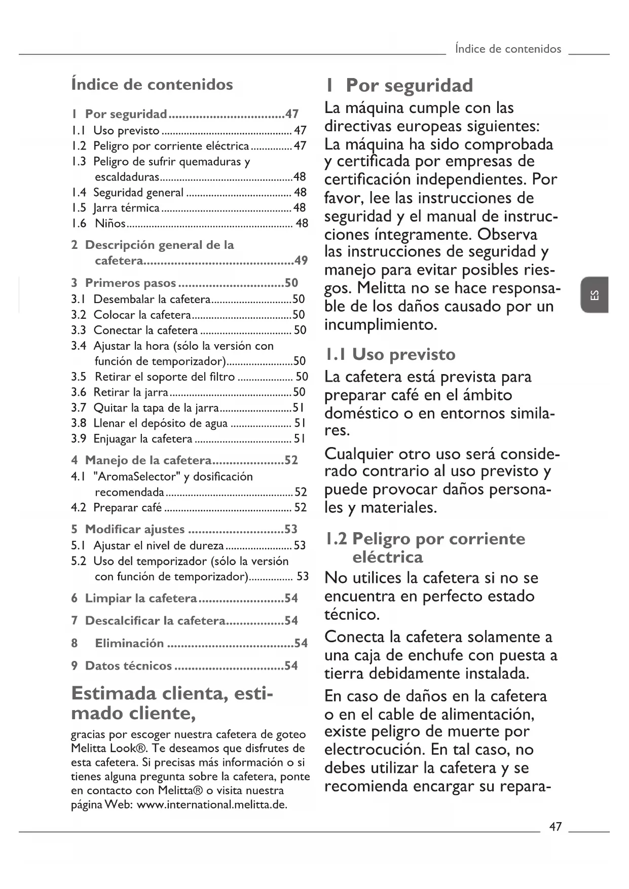 eléctrica No utilices la cafetera si no se encuentra en perfecto estado técnico. Conecta la cafetera solamente a una caja de enchufe con puesta a tierra debidamente instalada. En caso de daños en la cafetera o en el cable de alimentación, existe peligro de muerte por electrocución. En tal caso, no debes utilizar la cafetera y se recomienda encargar su repara- Estimada clienta, esti- mado cliente, gracias por escoger nuestra cafetera de goteo Melitta Look®. Te deseamos que disfrutes de esta cafetera. Si precisas más información o si tienes alguna pregunta sobre la cafetera, ponte en contacto con Melitta® o visita nuestra página Web: www.international.melitta.de.Por seguridad