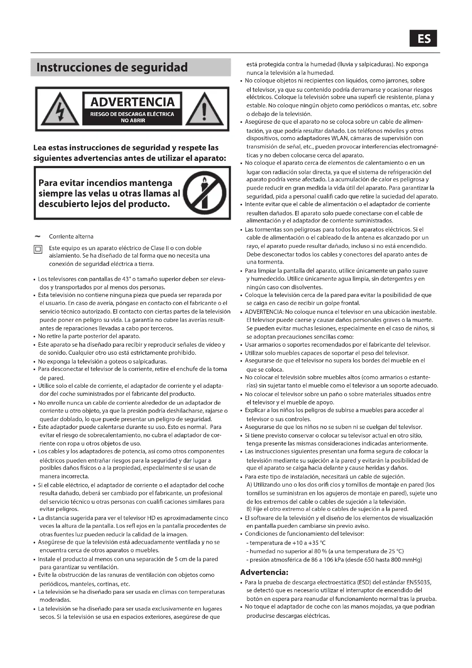 Lea estas instrucciones de seguridad y respete las siguientes advertencias antes de utilizar el aparato: Para evitar incendios mantenga siempre las velas u otras llamas al descubierto lejos del producto. Corriente alterna Este equipo es un aparato eléctrico de ClaseII o con doble aislamiento. Se ha diseñado de tal forma que no necesita una conexión de seguridad eléctrica a tierra.