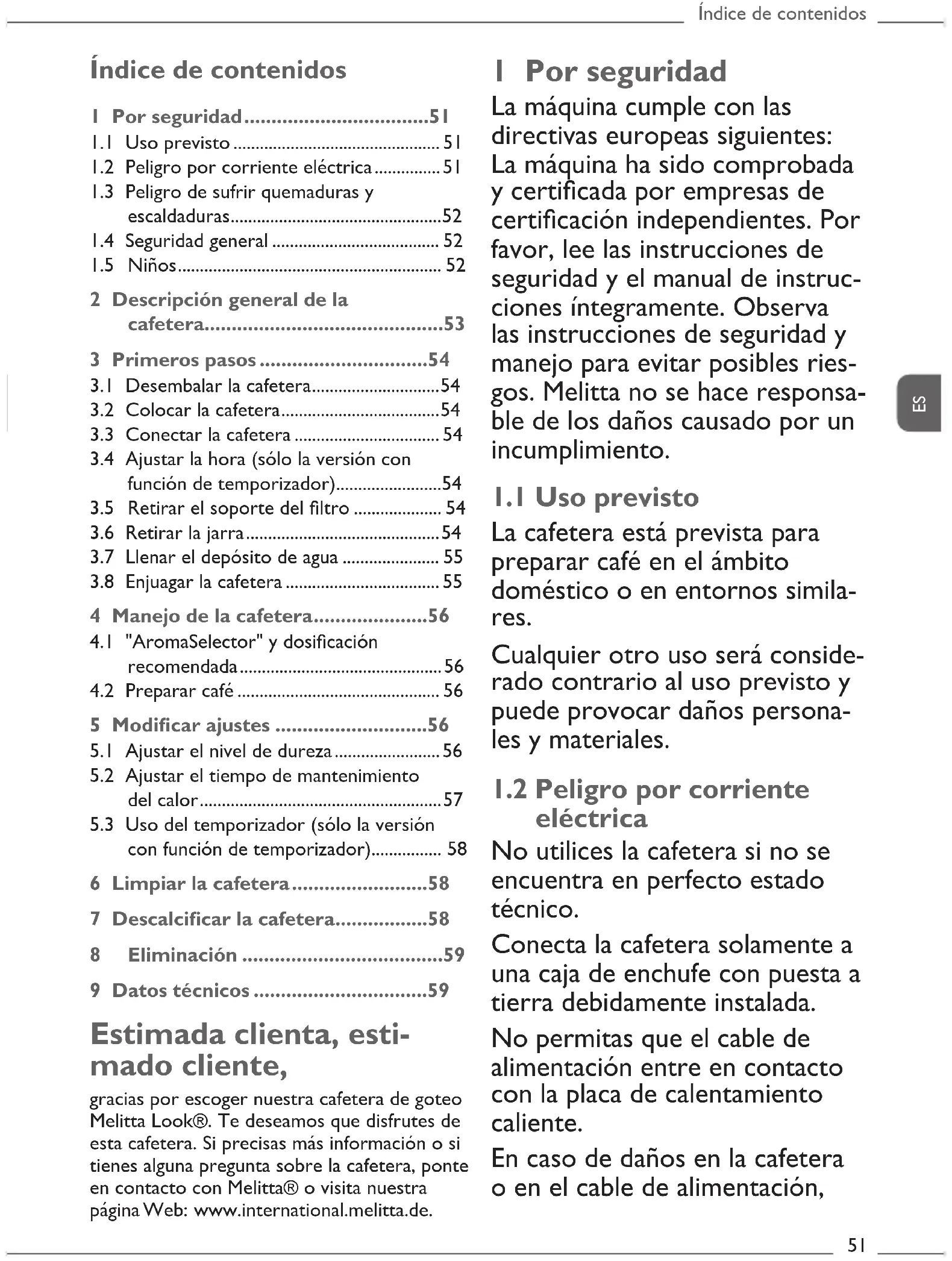 eléctrica No utilices la cafetera si no se encuentra en perfecto estado técnico. Conecta la cafetera solamente a una caja de enchufe con puesta a tierra debidamente instalada. No permitas que el cable de alimentación entre en contacto con la placa de calentamiento caliente. En caso de daños en la cafetera o en el cable de alimentación, Estimada clienta, esti- mado cliente, gracias por escoger nuestra cafetera de goteo Melitta Look®. Te deseamos que disfrutes de esta cafetera. Si precisas más información o si tienes alguna pregunta sobre la cafetera, ponte en contacto con Melitta® o visita nuestra página Web: www.international.melitta.de.Por seguridad