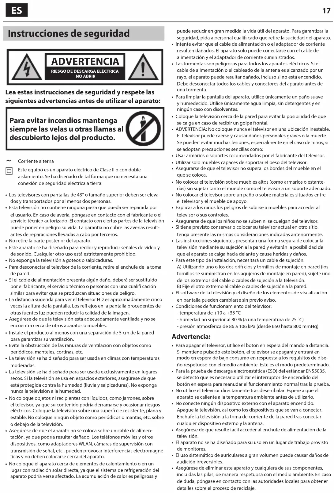 Lea estas instrucciones de seguridad y respete las siguientes advertencias antes de utilizar el aparato: Para evitar incendios mantenga siempre las velas u otras llamas al descubierto lejos del producto. Corriente alterna Este equipo es un aparato eléctrico de ClaseII o con doble aislamiento. Se ha diseñado de tal forma que no necesita una conexión de seguridad eléctrica a tierra.