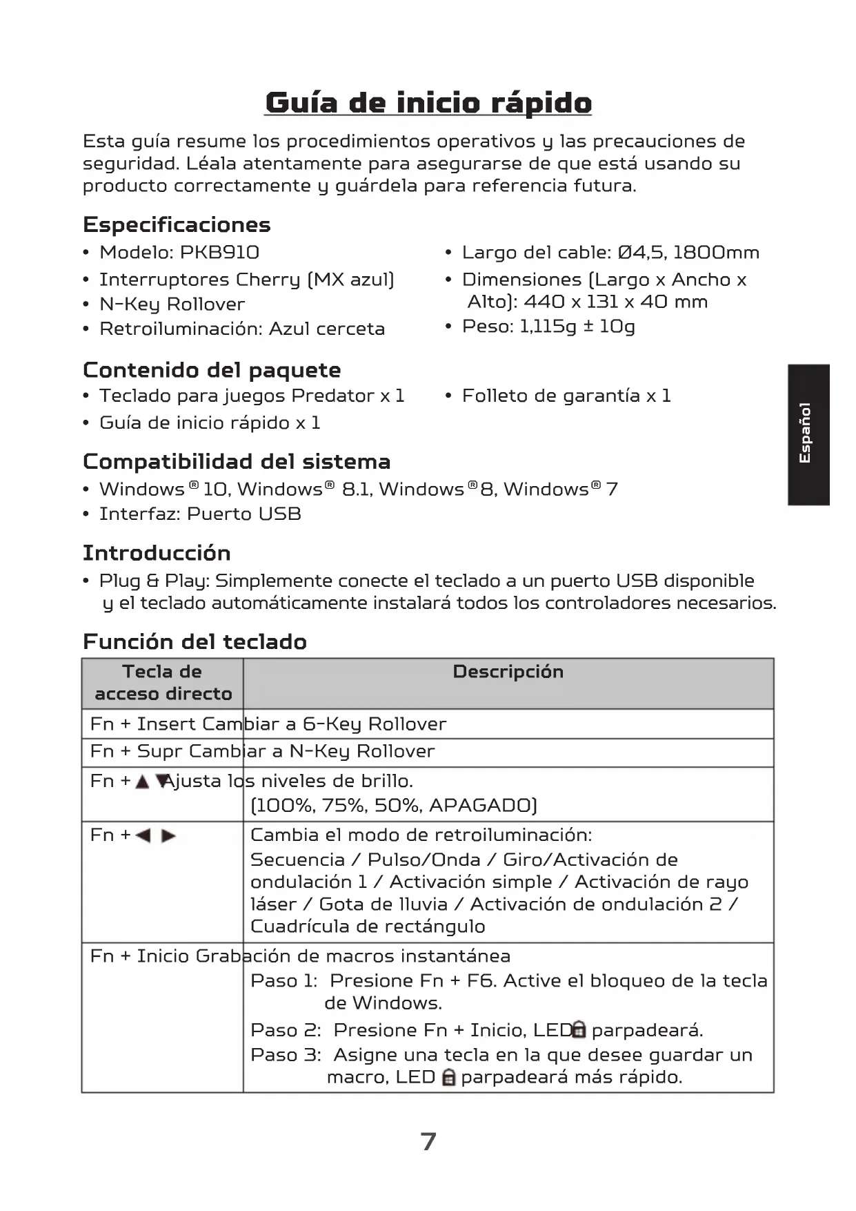 - Plug & Play: Simplemente conecte el teclado a un puerto USB disponible y el teclado automáticamente instalará todos los controladores necesarios. Función del teclado Tecla de acceso directo Descripción Fn + Insert Cambiar a 6-Key Rollover Fn + Supr Cambiar a N-Key Rollover Fn + Ajusta los niveles de brillo. (100%, 75%, 50%, APAGADO) Fn + Cambia el modo de retroiluminación: Secuencia / Pulso/Onda / Giro/Activación de ondulación 1 / Activación simple / Activación de rayo láser / Gota de lluvia / Activación de ondulación 2 / Cuadrícula de rectángulo Fn + Inicio Grabación de macros instantánea Paso 1: Presione Fn + F6. Active el bloqueo de la tecla de Windows. Paso 2: Presione Fn + Inicio, LED parpadeará. Paso 3: Asigne una tecla en la que desee guardar un macro, LED parpadeará más rápido.8 Español Tecla de acceso directo Descripción Paso 4: Escriba tecla en la lista de macros. Paso 5: Presione Fn + Inicio, finalizará la grabación de macros instantánea. El proceso de grabación finalizará si no hay ninguna acción dentro de 20 segundos. Pautas de confort Algunas investigaciones han sugerido que períodos prolongados de movimientos repetitivos; el uso inapropiado de un espacio de funcionamiento, la posición corporal y malos hábitos de trabajo pueden estar asociados con molestias físicas y daños a nervios, tendones y músculos. A continuación encontrará algunas pautas para optimizar el confort y evitar lesiones.