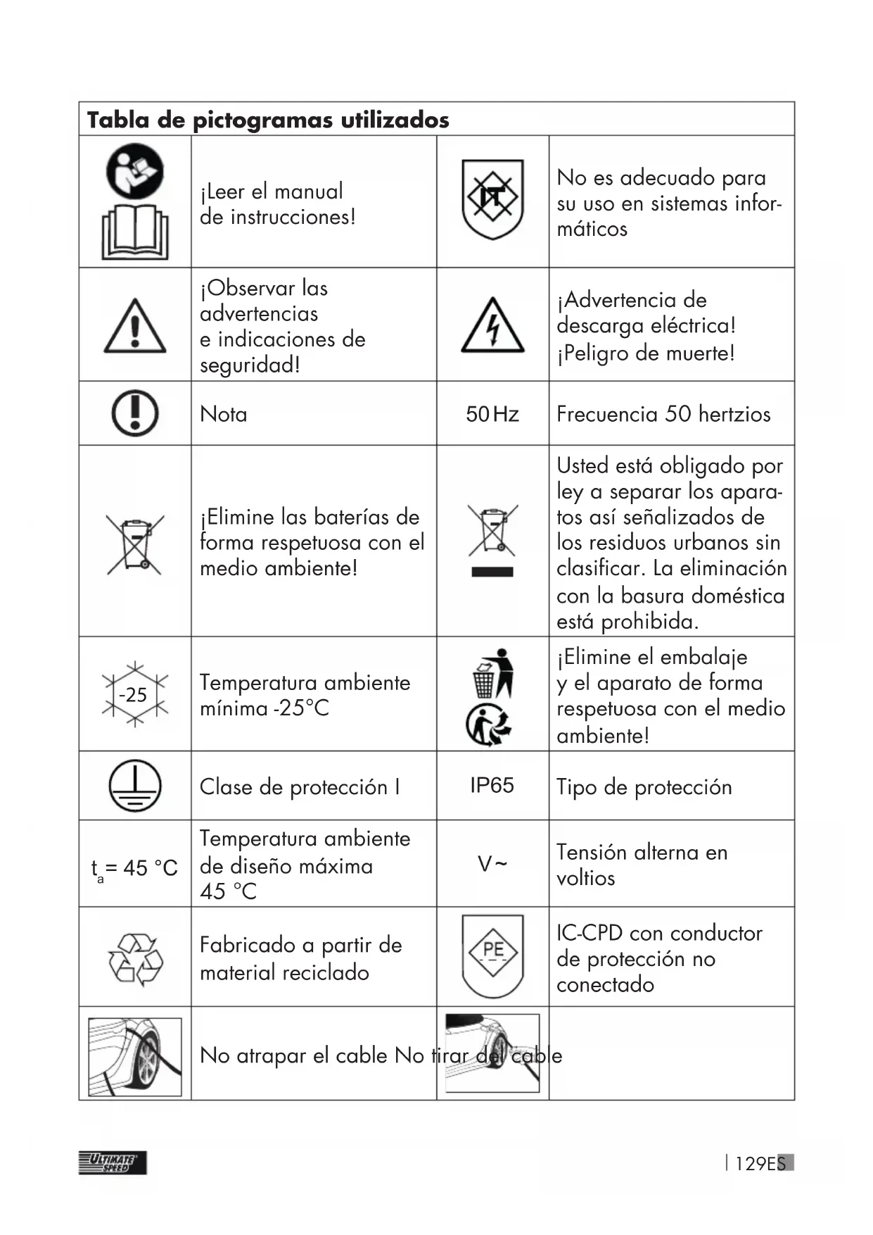 = 45 °C Temperatura ambiente de diseño máxima 45 °C V ~ Tensión alterna en voltios Fabricado a partir de material reciclado IC-CPD con conductor de protección no conectado No atrapar el cable No tirar del cable130 ES