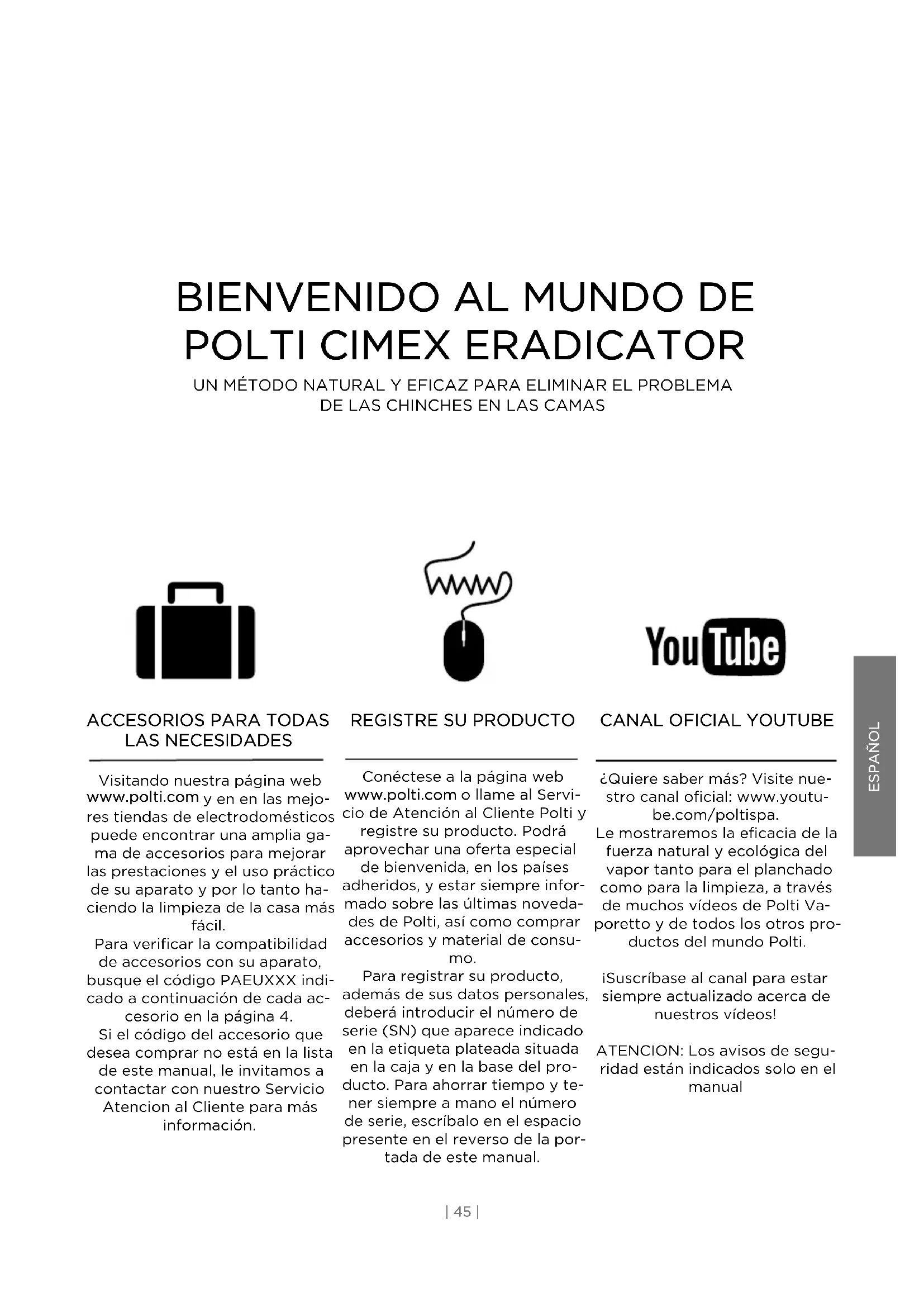 Este aparato está destinado al uso doméstico como generador de vapor sobrecalentado a 180 °C para la desinfección de las chinches de las camas. Para utilizar correctamente el producto, consulte las instrucciones ofrecidas en este manual. Se ruega leer atentamente estas instrucciones y conservarlas para futuras consultas; en caso de pérdida del presente manual de instrucciones, se puede consultar y/o descargar de la página web www.polti.com. No dejar nunca el aparato expuesto a los agentes climatológicos. POLTI S.p.A se reserva el derecho de introducir las modificaciones estéticas, técnicas y constructivas que considere necesarias, sin obligación de preaviso. Antes de dejar la fábrica todos nuestros productos se someten a rigurosas pruebas. Por lo tanto Polti Cimex Eradicator puede contener agua residual en la caldera o en el depósito. El uso conforme del producto es exclusivamente el que aparece en el presente manual de instrucciones. Todo uso diferente puede dañar el aparato e invalidar la garantía.