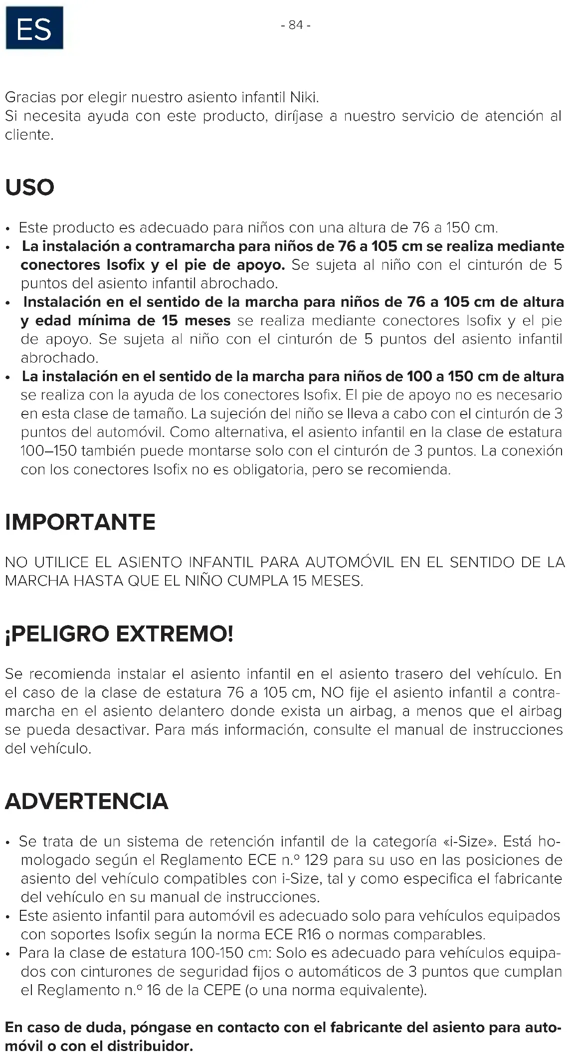 Gracias por elegir nuestro asiento infantil Niki. Si necesita ayuda con este producto, diríjase a nuestro servicio de atención al cliente. USO