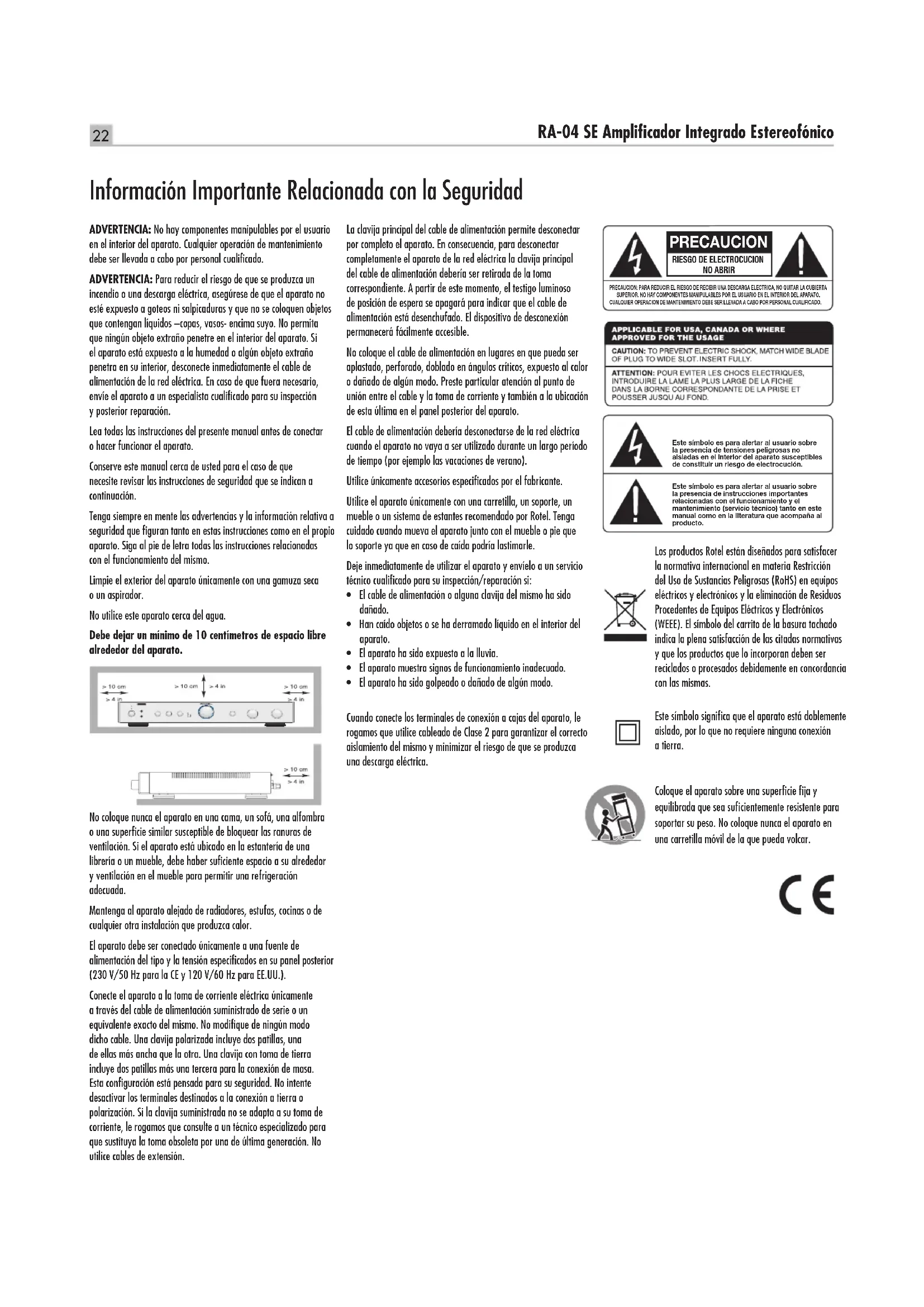 - Elaparatohasidogolpeadoodañadodealgúnmodo. Cuando conecte los terminales de conexión a cajas del aparato, le rogamos que utilice cableado de Clase 2 para garantizar el correcto aislamiento del mismo y minimizar el riesgo de que se produzca una descarga eléctrica. ADVERTENCIA: No hay componentes manipulables por el usuario en el interior del aparato. Cualquier operación de mantenimiento debe ser llevada a cabo por personal cualificado. ADVERTENCIA: Para reducir el riesgo de que se produzca un incendio o una descarga eléctrica, asegúrese de que el aparato no esté expuesto a goteos ni salpicaduras y que no se coloquen objetos que contengan líquidos –copas, vasos- encima suyo. No permita que ningún objeto extraño penetre en el interior del aparato. Si el aparato está expuesto a la humedad o algún objeto extraño penetra en su interior, desconecte inmediatamente el cable de alimentación de la red eléctrica. En caso de que fuera necesario, envíe el aparato a un especialista cualificado para su inspección y posterior reparación. Lea todas las instrucciones del presente manual antes de conectar o hacer funcionar el aparato. Conserve este manual cerca de usted para el caso de que necesite revisar las instrucciones de seguridad que se indican a continuación. Tenga siempre en mente las advertencias y la información relativa a seguridad que figuran tanto en estas instrucciones como en el propio aparato. Siga al pie de letra todas las instrucciones relacionadas con el funcionamiento del mismo. Limpie el exterior del aparato únicamente con una gamuza seca o un aspirador. No utilice este aparato cerca del agua. Debe dejar un mínimo de 10 centímetros de espacio libre alrededor del aparato. No coloque nunca el aparato en una cama, un sofá, una alfombra o una superficie similar susceptible de bloquear las ranuras de ventilación. Si el aparato está ubicado en la estantería de una librería o un mueble, debe haber suficiente espacio a su alrededor y ventilación en el mueble para permitir una refrigeración adecuada. Mantenga al aparato alejado de radiadores, estufas, cocinas o de cualquier otra instalación que produzca calor. El aparato debe ser conectado únicamente a una fuente de alimentación del tipo y la tensión especificados en su panel posterior (230 V/50 Hz para la CE y 120 V/60 Hz para EE.UU.). Conecte el aparato a la toma de corriente eléctrica únicamente a través del cable de alimentación suministrado de serie o un equivalente exacto del mismo. No modifique de ningún modo dicho cable. Una clavija polarizada incluye dos patillas, una de ellas más ancha que la otra. Una clavija con toma de tierra incluye dos patillas más una tercera para la conexión de masa. Esta configuración está pensada para su seguridad. No intente desactivar los terminales destinados a la conexión a tierra o polarización. Si la clavija suministrada no se adapta a su toma de corriente, le rogamos que consulte a un técnico especializado para que sustituya la toma obsoleta por una de última generación. No utilice cables de extensión. Los productos Rotel están diseñados para satisfacer la normativa internacional en materia Restricción del Uso de Sustancias Peligrosas (RoHS) en equipos eléctricos y electrónicos y la eliminación de Residuos Procedentes de Equipos Eléctricos y Electrónicos (WEEE). El símbolo del carrito de la basura tachado indica la plena satisfacción de las citadas normativas y que los productos que lo incorporan deben ser reciclados o procesados debidamente en concordancia con las mismas. Información Importante Relacionada con la Seguridad Este símbolo significa que el aparato está doblemente aislado, por lo que no requiere ninguna conexión a tierra. Coloque el aparato sobre una superficie fija y equilibrada que sea suficientemente resistente para soportar su peso. No coloque nunca el aparato en una carretilla móvil de la que pueda volcar. PRECAUCION RIESGO DE ELECTROCUCIONNO ABRIRPRECAUCION: PARA REDUCIR EL RIESGO DE RECIBIR UNA DESCARGA ELECTRICA, NO QUITAR LA CUBIERTA SUPERIOR. NO HAY COMPONENTES MANIPULABLES POR EL USUARIO EN EL INTERIOR DEL APARAT O. CUALQUIER OPERACION DE MANTENIMIENTO DEBE SER LLEVADA A CABO POR PERSONAL CUALIFICADO. Este símbolo es para alertar al usuario sobre la presencia de tensiones peligrosas no aisladas en el interior del aparato susceptibles de constituir un riesgo de electrocución. Este símbolo es para alertar al usuario sobre la presencia de instrucciones importantes relacionadas con el funcionamiento y el mantenimiento (servicio técnico) tanto en este manual como en la literatura que acompaña al producto.23 Español Acerca de Rotel Nuestra historia empezó hace casi 50 años. A lo largo de todas estas décadas, hemos recibido cientos de premios por nuestros productos y satisfecho centenares de miles de clientes que se toman muy en serio, al igual que usted, sus momentos de ocio. Rotel fue fundada por una familia cuyo entusiasta interés por la música le condujo a diseñar y construir componentes de Alta Fidelidad sin ningún tipo de compromiso. Esta pasión ha permanecido inalterada durante todo este tiempo, hasta el punto de que el objetivo de los fundadores de la compañía -proporcionar productos de la máxima calidad a melómanos y audiófilos independientemente de cuales sean sus posibilidades económicas- es compartido por todos sus empleados. Los ingenieros de Rotel trabajan como un equipo compacto, escuchando y llevando a cabo el ajuste fino de cada nuevo producto hasta que satisface de manera exacta los estándares de calidad musical para los que fue diseñado. Para lograrlo, disponen de la máxima libertad para escoger los mejores componentes allí donde se encuentren. Le sorprenderá agradablemente encontrar exquisitos condensadores procedentes del Reino Unido y Alemania o semiconductores de Japón o Estados Unidos, mientras que los transformadores toroidales de potencia son construidos en la propi