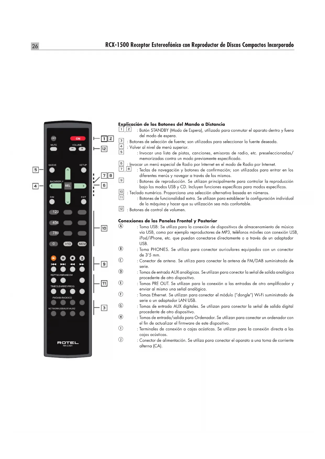 - Características Técnicas RCX1500_ENG_SPA_FRE_GER_DUT_ITA_RUS_SWE.indb 28 27/8/10 13:52:2929 Español Acerca de Rotel Nuestra historia empezó hace casi 50 años. A lo largo de todas estas décadas, hemos recibido cientos de premios por nuestros productos y satisfecho centenares de miles de clientes que se toman muy en serio, al igual que usted, sus momentos de ocio. Rotel fue fundada por una familia cuyo entusiasta interés por la música le condujo a diseñar y construir componentes de Alta Fidelidad sin ningún tipo de compromiso. Esta pasión ha permanecido inalterada durante todo este tiempo, hasta el punto de que el objetivo de los fundadores de la compañía -proporcionar productos de la máxima calidad a melómanos y audiófilos independientemente de cuales sean sus posibilidades económicas- es compartido por todos sus empleados. Los ingenieros de Rotel trabajan como un equipo compacto, escuchando y llevando a cabo el ajuste fino de cada nuevo producto hasta que satisface de manera exacta los estándares de calidad musical para los que fue diseñado. Para lograrlo, disponen de la máxima libertad para escoger los mejores componentes allí donde se encuentren. Le sorprenderá agradablemente encontrar exquisitos condensadores procedentes del Reino Unido y Alemania o semiconductores de Japón o Estados Unidos, mientras que los transformadores de alimentación toroidales son fabricados en la propia factoría de Rotel. Todos nosotros nos preocupamos por nuestro entorno. Y a medida que se producen y posteriormente desechan más y más aparatos electrónicos, para un fabricante resulta especialmente importante hacer todo lo que le sea posible para poner a punto productos que tengan un impacto negativo mínimo en los vertederos de basura y las capas freáticas. En Rotel estamos orgullosos de contribuir con nuestra parte. Hemos reducido el contenido en plomo de nuestros componentes electrónicos utilizando una soldadura RoHS especial, mientras que nuestros nuevos amplificadores en Clase D (que no digitales) son hasta cinco veces más eficientes que nuestros diseños tradicionales a la vez que siguen ofreciendo una excelente dosis de potencia y prestaciones. La temperatura de funcionamiento de estos productos es baja y la energía que desperdician es mínima, a la vez que son amables con el medio ambiente y proporcionan un sonido superior. Finalmente, queremos que sepa que hemos impreso este catálogo en papel reciclado. Aunque entendemos que estas últimas consideraciones son sólo unos primeros pasos, también tenemos muy claro que ello no quita que sean importantes. Y continuaremos buscando nuevos materiales y métodos de fabricación para conseguir que nuestros procesos de fabricación sean lo más limpios y ecológicos posible. Le agradecemos que haya adquirido este producto. Estamos seguros de que le proporcionará largos años de disfrute en la escucha de sus grabaciones musicales favoritas. Para Empezar Gracias por haber adquirido el Receptor Estereofónico con Reproductor de CD Incorporado Rotel RCX-1500. Utilizado en un sistema de reproducción musical o audiovisual de alta calidad, le proporcionará largos años de disfrute. Características Relevantes Conexión por cable o inalámbrica para acceder a radio de Internet.• Acceso a PC’s y música mediante conexión en red (LAN) con el • Modo “Media Player”. Conexión de reproductores multimedia portátiles iPod/MP3 para • el disfrute de sus grabaciones musicales favoritas. Escucha de emisiones de radio DAB y FM.• Reproducción de grabaciones MP3 o WMA grabadas en CD.• Dos canales de amplificación con una salida de 100 vatios • continuos cada uno. Algunas Precauciones Le rogamos que lea cuidadosamente el presente manual de instrucciones. Además de las instrucciones básicas de instalación y puesta a punto del RCX-1500, incluye información de gran valor sobre las diferentes configuraciones que permite el aparato, así como información general que le ayudará a optimizar las prestaciones de su sistema. Le rogamos que contacte con su distribuidor Rotel autorizado para cualquier duda o consulta que se le pueda plantear. No le quepa la menor duda de que todos sus comentarios y observaciones serán tenidos en cuenta. Guarde el embalaje del RCX-1500 y todo el material en él contenido para un posible uso futuro del mismo. El embalaje o transporte del RCX- 1500 en condiciones diferentes de las originales puede provocar serios datos en el aparato no cubiertos por la garantía. Rellene y envíe la tarjeta de garantía suministrada junto con el RCX-1500. Asimismo, asegúrese de mantener en su poder la factura de compra puesto que es la mejor manera de que usted se acuerde de la fecha de compra, un dato esencial en caso de que necesitara asistencia técnica durante el período de garantía. Ubicación Coloque el RCX-1500 sobre una superficie sólida y nivelada que esté alejada de la luz solar, el calor, la humedad y las vibraciones. No coloque otros componentes u objetos en la parte superior del RCX-1500. No permita que ningún líquido se vierta en el interior del aparato. Tenga en cuenta el peso y el tamaño del aparato cuando seleccione una ubicación determinada para la instalación del mismo. En consecuencia, asegúrese de que la estantería, mueble o rack utilizado pueda soportarlo sin mayores problemas. El RCX-1500 genera calor como una parte de su funcionamiento normal. No bloquee las ranuras de ventilación. Deje un mínimo 10 centímetros de espacio libre alrededor del aparato. En el caso de que el RCX-1500 esté instalado en un mueble, asegúrese de que se dispone de una ventilación adecuada. RCX1500_ENG_SPA_FRE_GER_DUT_ITA_RUS_SWE.indb 29 27/8/10 13:52:2930 RCX-1500 Receptor Estereofónico con Reproductor de Discos Compactos Incorporado Repaso – Los sintonizadores de radio por Internet/componentes digitales avanzados de Rotel DEste producto no funciona si previamente no le ha sido conectado el módulo