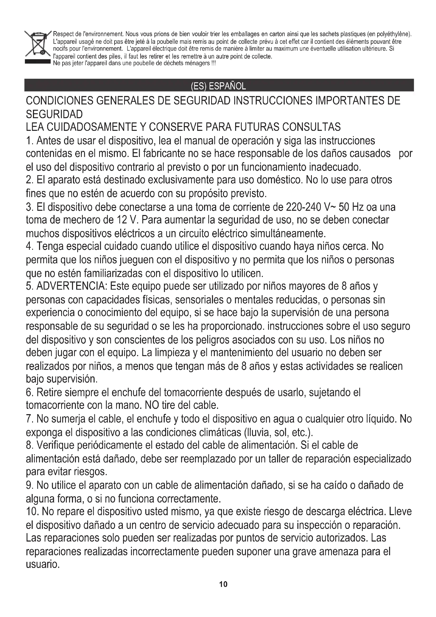 permita que los niños jueguen con el dispositivo y no permita que los niños o personas que no estén familiarizadas con el dispositivo lo utilicen. CONDICIONES GENERALES DE SEGURIDAD INSTRUCCIONES IMPORTANTES DE SEGURIDAD