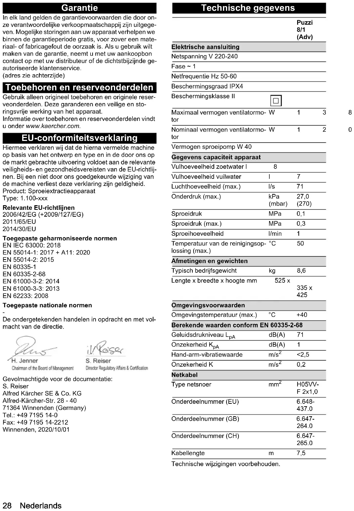 cial) en el recipiente de agua sucia. Servicio de postventa Si no se puede solventar el fallo, el Servicio de postven- ta debe comprobar el equipo. Garantía En cada país se aplican las condiciones de garantía in- dicadas por nuestra compañía distribuidora autorizada. Subsanamos cualquier fallo en su equipo de forma gra- tuita dentro del plazo de garantía siempre que la causa se deba a un fallo de fabricación o material. En caso de garantía, póngase en contacto con su distribuidor o con el servicio de postventa autorizado más próximo pre- sentando la factura de compra. (Dirección en el reverso) Accesorios y recambios Utilice únicamente accesorios y recambios originales, estos garantizan un servicio seguro y fiable del equipo. Encontrará información sobre los accesorios y recam- bios en www.kaercher.com. Declaración de conformidad UE Por la presente declaramos que la máquina designada a continuación cumple, en lo que respecta a su diseño y ti- po constructivo así como a la versión puesta a la venta por nosotros, las normas básicas de seguridad y sobre la salud que figuran en las directivas comunitarias corres- pondientes. Si se producen modificaciones no acorda- das en la máquina, esta declaración pierde su validez. Producto: Equipo pulverización y aspiración combina- das Tipo: 1.100-xxx Directivas UE aplicables 2006/42/CE (+2009/127/CE) 2011/65/UE 2014/30/UE Normas armonizadas aplicadas EN IEC 63000: 2018 EN 55014-1: 2017 + A11: 2020 EN 55014-2: 2015 EN 60335-1 EN 60335-2-68 EN 61000-3-2: 2014 EN 61000-3-3: 2013 EN 62233: 2008 Normas nacionales aplicadas