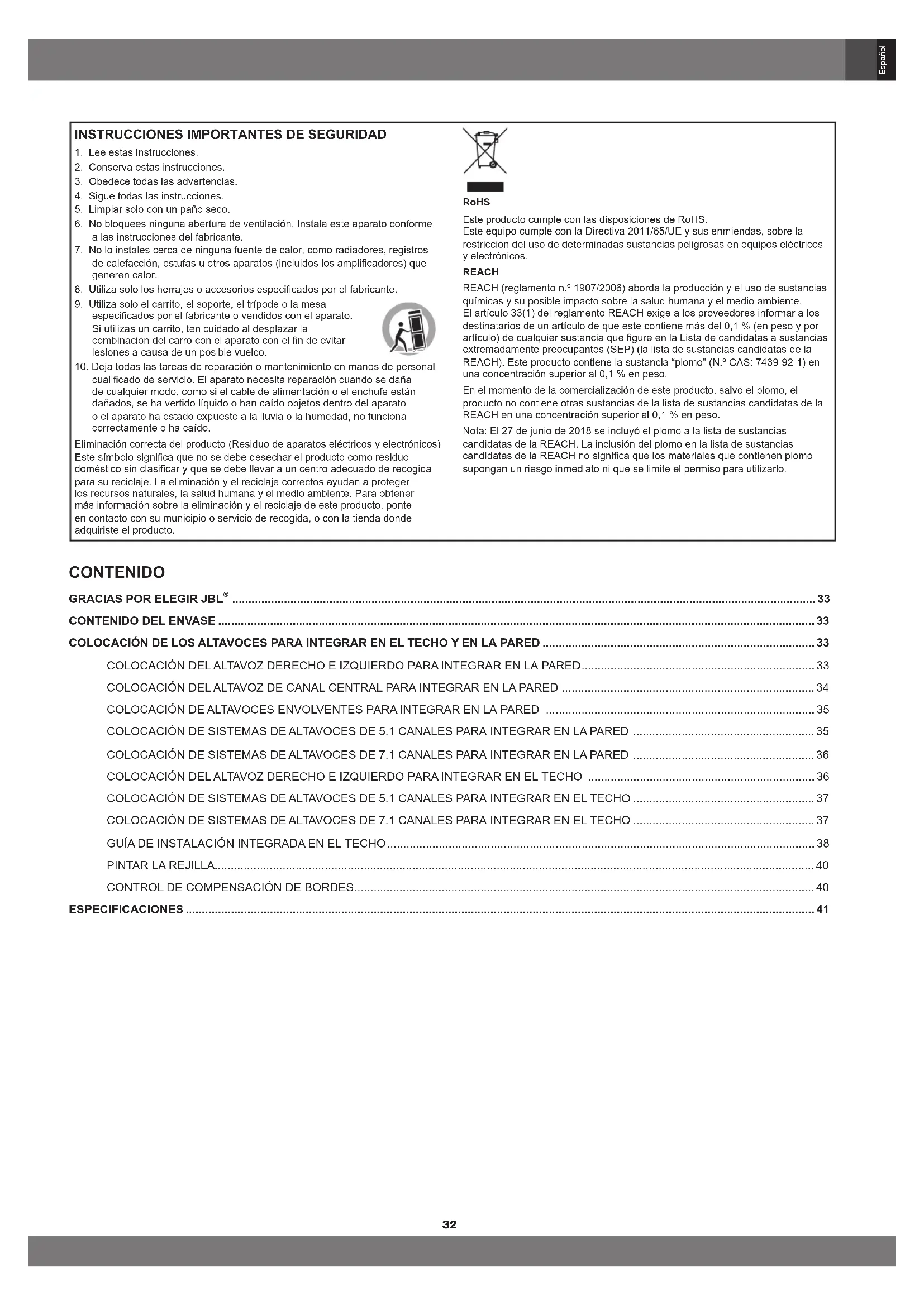 cualicado de servicio. El aparato necesita reparación cuando se daña de cualquier modo, como si el cable de alimentación o el enchufe están dañados, se ha vertido líquido o han caído objetos dentro del aparato o el aparato ha estado expuesto a la lluvia o la humedad, no funciona correctamente o ha caído. Eliminación correcta del producto (Residuo de aparatos eléctricos y electrónicos) Este símbolo signica que no se debe desechar el producto como residuo doméstico sin clasicar y que se debe llevar a un centro adecuado de recogida para su reciclaje. La eliminación y el reciclaje correctos ayudan a proteger los recursos naturales, la salud humana y el medio ambiente. Para obtener más información sobre la eliminación y el reciclaje de este producto, ponte en contacto con su municipio o servicio de recogida, o con la tienda donde adquiriste el producto. RoHS Este producto cumple con las disposiciones de RoHS. Este equipo cumple con la Directiva 2011/65/UE y sus enmiendas, sobre la restricción del uso de determinadas sustancias peligrosas en equipos eléctricos y electrónicos. REACH REACH (reglamento n.º 1907/2006) aborda la producción y el uso de sustancias químicas y su posible impacto sobre la salud humana y el medio ambiente. El artículo 33(1) del reglamento REACH exige a los proveedores informar a los destinatarios de un artículo de que este contiene más del 0,1 % (en peso y por artículo) de cualquier sustancia que gure en la Lista de candidatas a sustancias extremadamente preocupantes (SEP) (la lista de sustancias candidatas de la REACH). Este producto contiene la sustancia “plomo” (N.º CAS: 7439-92-1) en una concentración superior al 0,1 % en peso. En el momento de la comercialización de este producto, salvo el plomo, el producto no contiene otras sustancias de la lista de sustancias candidatas de la REACH en una concentración superior al 0,1 % en peso. Nota: El 27 de junio de 2018 se incluyó el plomo a la lista de sustancias candidatas de la REACH. La inclusión del plomo en la lista de sustancias candidatas de la REACH no signica que los materiales que contienen plomo supongan un riesgo inmediato ni que se limite el permiso para utilizarlo. CONTENIDO