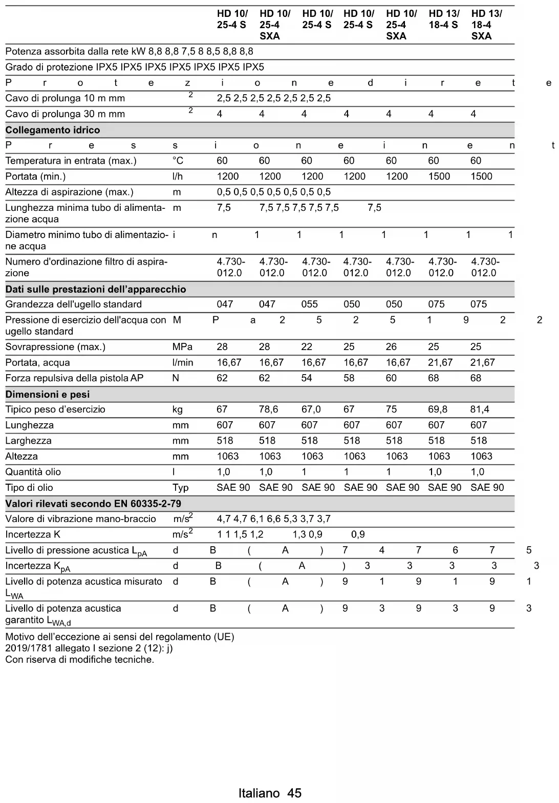 Datos de potencia del equipo Tamaño de la boquilla estándar 047 047 047 050 050 050 050 Presión de funcionamiento del agua con boquilla estándar MPa20202023232321 Sobrepresión de servicio (máx.) MPa 25 25 25 25 25 25 25 Volumen transportado, agua l/min 15 15 15 16,7 16,7 16,7 16,67 Fuerza de retroceso de la pistola de alta presión N 48494956565656 Peso y dimensiones Peso de servicio típico kg 62,4 67,1 74 63,4 68,1 75 63,4 Longitud mm 607 607 607 607 607 607 607 Anchura mm 518 518 518 518 518 518 518 Altura mm 1063 1063 1063 1063 1063 1063 1063 Cantidad de aceite l 1,0 1,0 1,0 1,0 1,0 1,0 1 Tipo de aceite Tipo SAE 90 SAE 90 SAE 90 SAE 90 SAE 90 SAE 90 SAE 90 Valores calculados conforme a EN 60335-2-79 Nivel de vibraciones mano-brazo m/s