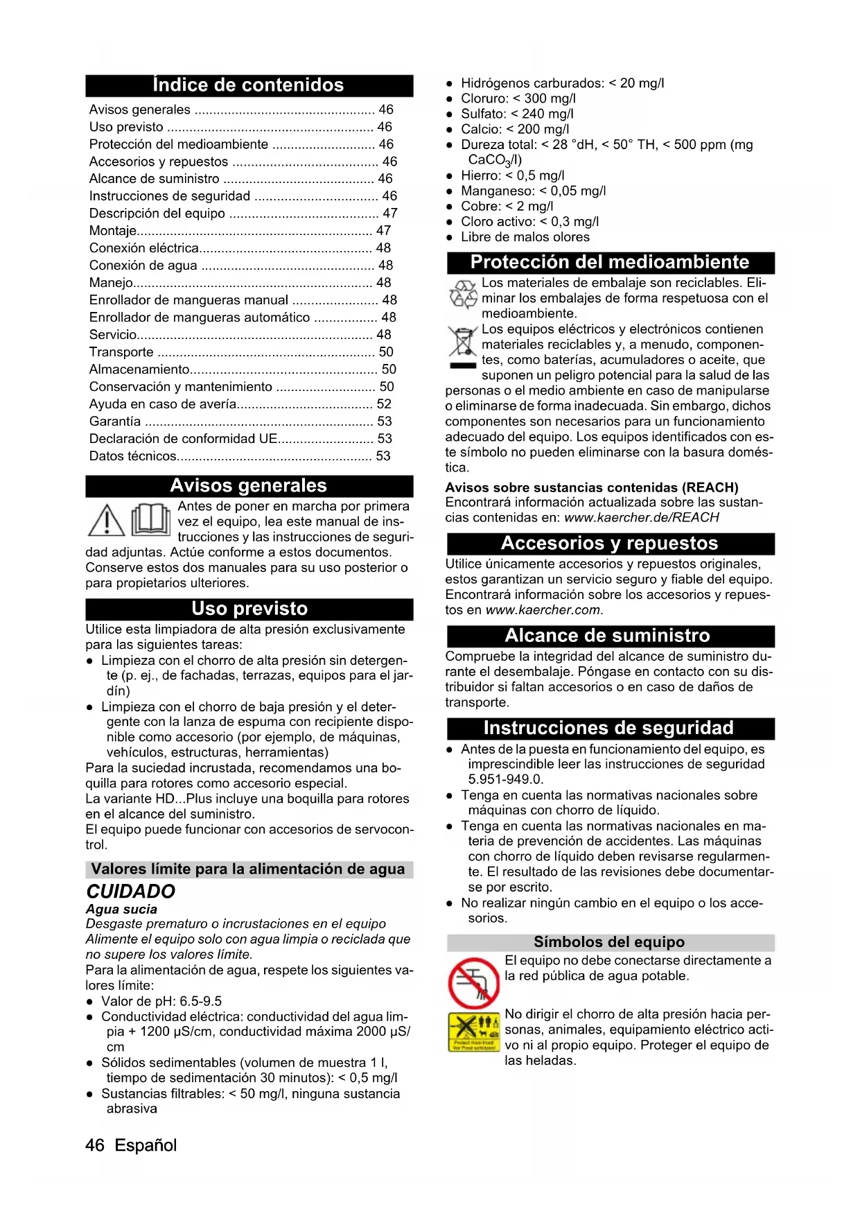 - /l) ● Hierro: < 0,5 mg/l ● Manganeso: < 0,05 mg/l ● Cobre: < 2 mg/l ● Cloro activo: < 0,3 mg/l ● Libre de malos olores Protección del medioambiente Los materiales de embalaje son reciclables. Eli- minar los embalajes de forma respetuosa con el medioambiente. Los equipos eléctricos y electrónicos contienen materiales reciclables y, a menudo, componen- tes, como baterías, acumuladores o aceite, que suponen un peligro potencial para la salud de las personas o el medio ambiente en caso de manipularse o eliminarse de forma inadecuada. Sin embargo, dichos componentes son necesarios para un funcionamiento adecuado del equipo. Los equipos identificados con es- te símbolo no pueden eliminarse con la basura domés- tica. Avisos sobre sustancias contenidas (REACH) Encontrará información actualizada sobre las sustan- cias contenidas en: www.kaercher.de/REACH Accesorios y repuestos Utilice únicamente accesorios y repuestos originales, estos garantizan un servicio seguro y fiable del equipo. Encontrará información sobre los accesorios y repues- tos en www.kaercher.com. Alcance de suministro Compruebe la integridad del alcance de suministro du- rante el desembalaje. Póngase en contacto con su dis- tribuidor si faltan accesorios o en caso de daños de transporte. Instrucciones de seguridad ● Antes de la puesta en funcionamiento del equipo, es imprescindible leer las instrucciones de seguridad 5.951-949.0. ● Tenga en cuenta las normativas nacionales sobre máquinas con chorro de líquido. ● Tenga en cuenta las normativas nacionales en ma- teria de prevención de accidentes. Las máquinas con chorro de líquido deben revisarse regularmen- te. El resultado de las revisiones debe documentar- se por escrito. ● No realizar ningún cambio en el equipo o los acce- sorios. Símbolos del equipo El equipo no debe conectarse directamente a la red pública de agua potable. No dirigir el chorro de alta presión hacia per- sonas, animales, equipamiento eléctrico acti- vo ni al propio equipo. Proteger el equipo de las heladas. Avisos generales p. 46