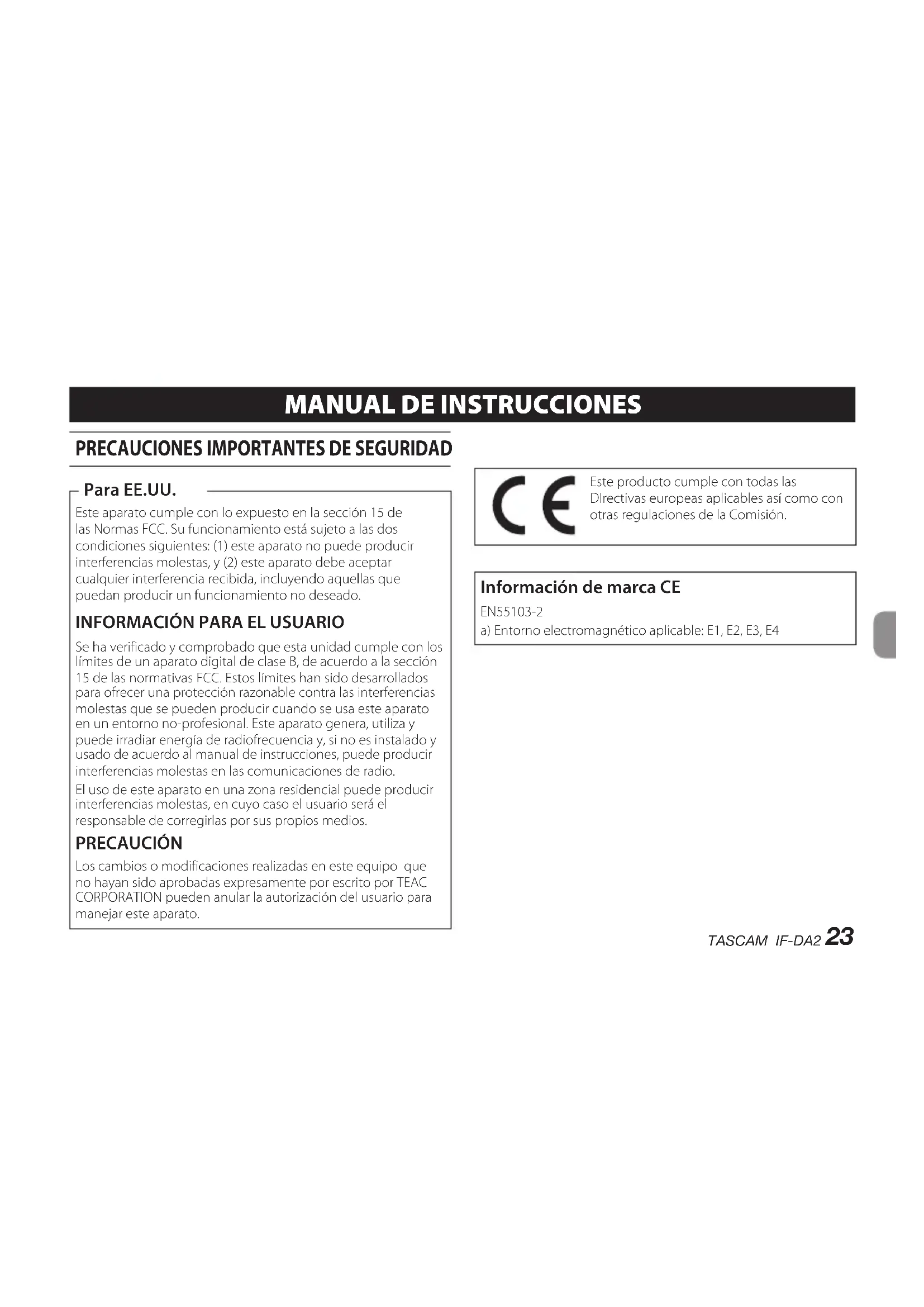 Se ha verificado y comprobado que esta unidad cumple con los límites de un aparato digital de clase B, de acuerdo a la sección 15 de las normativas FCC. Estos límites han sido desarrollados para ofrecer una protección razonable contra las interferencias molestas que se pueden producir cuando se usa este aparato en un entorno no-profesional. Este aparato genera, utiliza y puede irradiar energía de radiofrecuencia y, si no es instalado y usado de acuerdo al manual de instrucciones, puede producir interferencias molestas en las comunicaciones de radio. El uso de este aparato en una zona residencial puede producir interferencias molestas, en cuyo caso el usuario será el responsable de corregirlas por sus propios medios. PRECAUCIÓN Los cambios o modificaciones realizadas en este equipo que no hayan sido aprobadas expresamente por escrito por TEAC CORPORATION pueden anular la autorización del usuario para manejar este aparato. Para EE.UU. Este producto cumple con todas las DIrectivas europeas aplicables así como con otras regulaciones de la Comisión. Información de marca CE EN55103-2 a) Entorno electromagnético aplicable: E1, E2, E3, E424 TASCAM IF-DA2 Declaración de conformidad Referencia : IF-DA2 Marca : TASCAM Responsable : TEAC AMERICA, INC. Dirección : 1834 Gage Road, Montebello, California, U.S.A. Teléfono : 1-323-726-0303 Este dispositivo cumple con lo indicado en la sección 15 de las normas FCC y su funcionamiento está sujeto a las dos condiciones siguientes: (1) este aparato no debe producir interferencias molestas, y (2) este aparato debe aceptar cualquier interferencia que reciba, incluso aquellas que produzcan un funcionamiento no deseado.