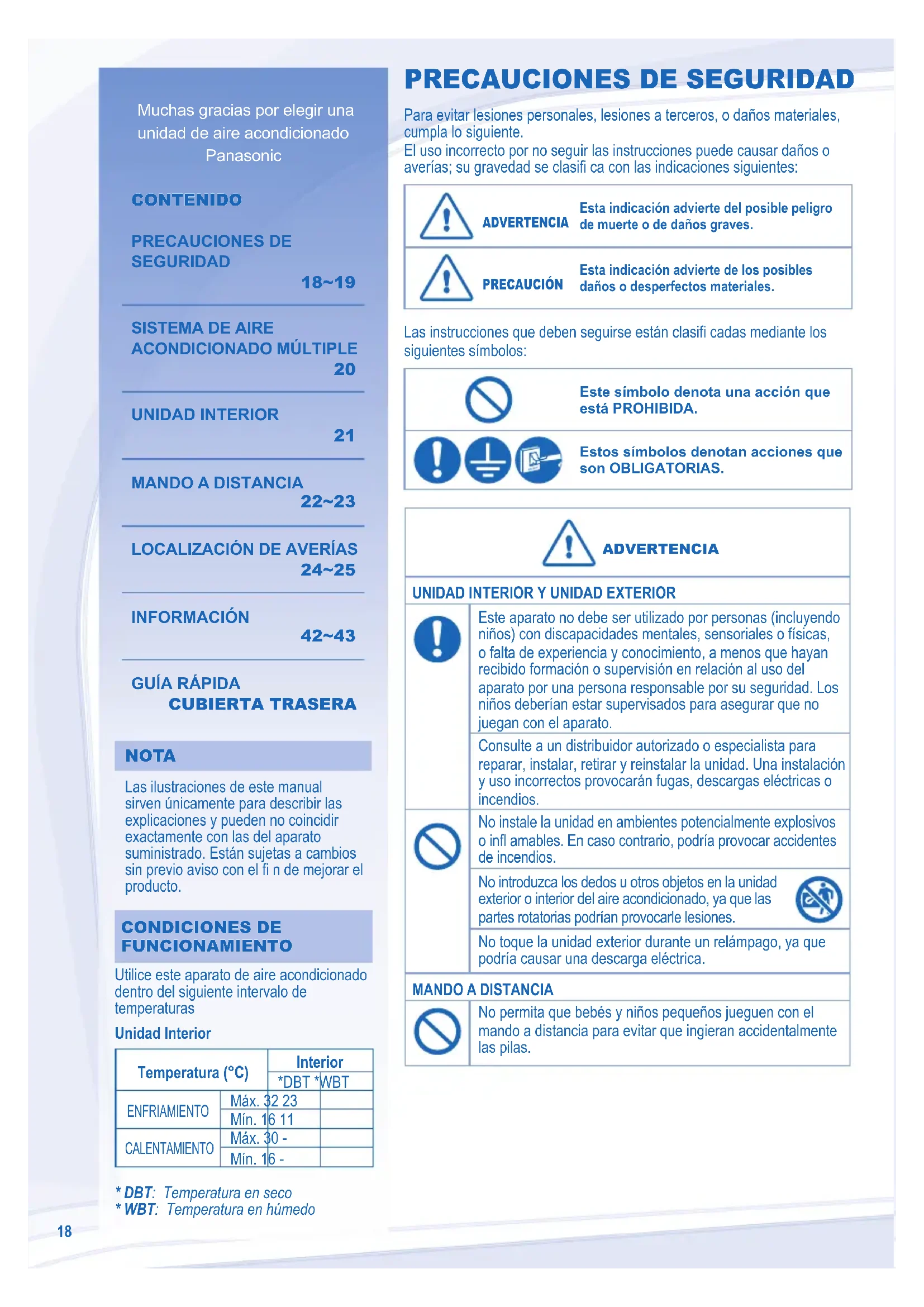 - WBT: Temperatura en húmedo Muchas gracias por elegir una unidad de aire acondicionado Panasonic CONTENIDO CONTENIDO PRECAUCIONES DE SEGURIDAD 18~19