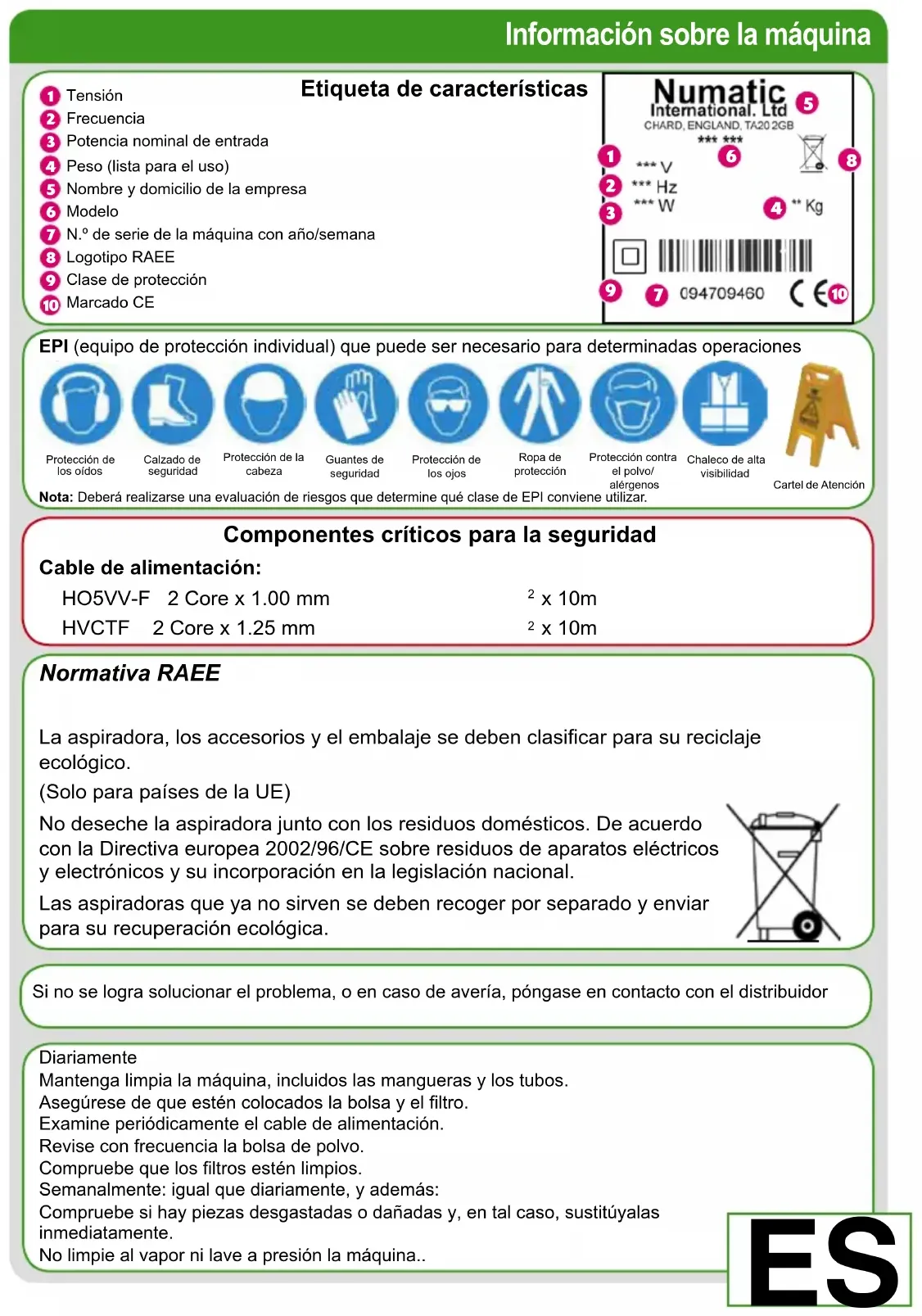 - Examine periódicamente el cable de alimentación. Si se le encuentra algún daño, una persona competente deberá sustituir el cable por el repuesto correcto original de Numatic.