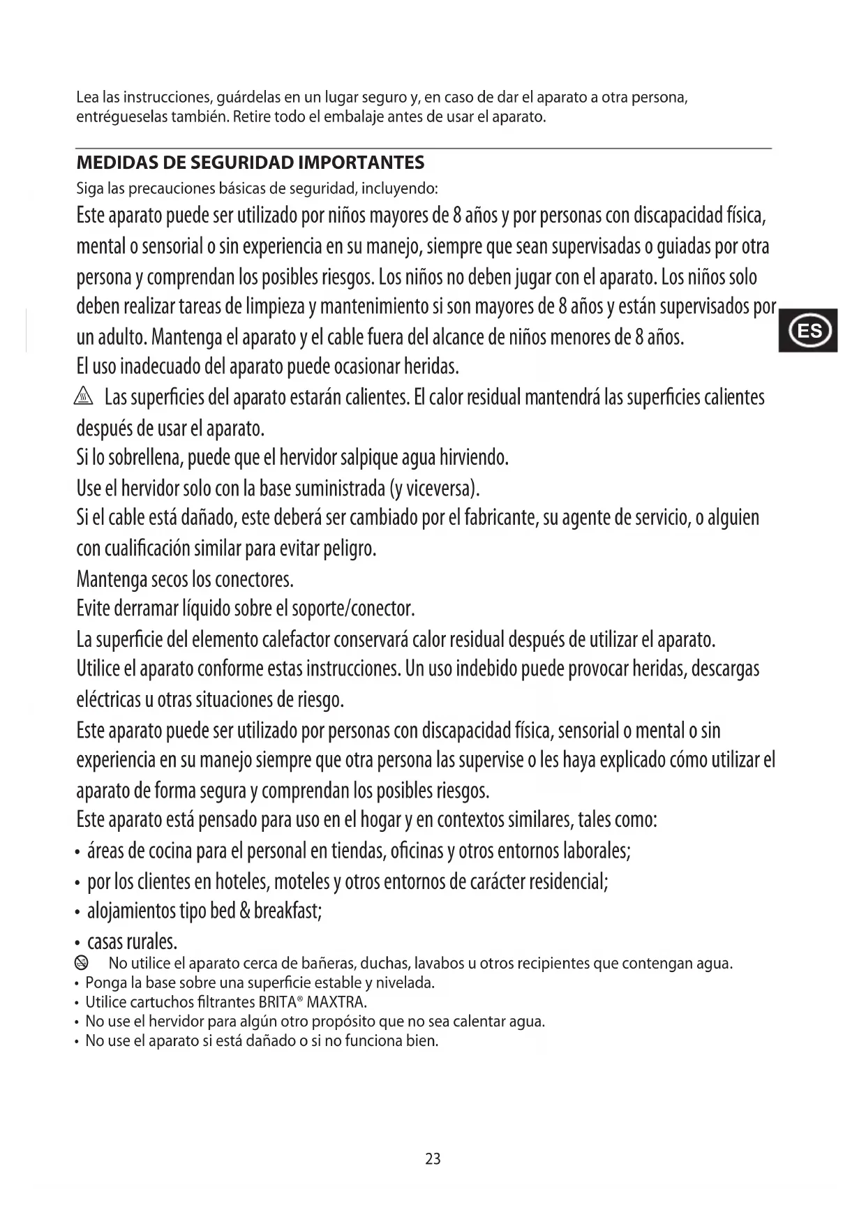 Siga las precauciones básicas de seguridad, incluyendo: Este aparato puede ser utilizado por niños mayores de 8 años y por personas con discapacidad física, mental o sensorial o sin experiencia en su manejo, siempre que sean supervisadas o guiadas por otra persona y comprendan los posibles riesgos. Los niños no deben jugar con el aparato. Los niños solo deben realizar tareas de limpieza y mantenimiento si son mayores de 8 años y están supervisados por un adulto. Mantenga el aparato y el cable fuera del alcance de niños menores de 8 años. El uso inadecuado del aparato puede ocasionar heridas. h Las superficies del aparato estarán calientes. El calor residual mantendrá las superficies calientes después de usar el aparato. Si lo sobrellena, puede que el hervidor salpique agua hirviendo. Use el hervidor solo con la base suministrada (y viceversa). Si el cable está dañado, este deberá ser cambiado por el fabricante, su agente de servicio, o alguien con cualificación similar para evitar peligro. Mantenga secos los conectores. Evite derramar líquido sobre el soporte/conector. La superficie del elemento calefactor conservará calor residual después de utilizar el aparato. Utilice el aparato conforme estas instrucciones. Un uso indebido puede provocar heridas, descargas eléctricas u otras situaciones de riesgo. Este aparato puede ser utilizado por personas con discapacidad física, sensorial o mental o sin experiencia en su manejo siempre que otra persona las supervise o les haya explicado cómo utilizar el aparato de forma segura y comprendan los posibles riesgos. Este aparato está pensado para uso en el hogar y en contextos similares, tales como: