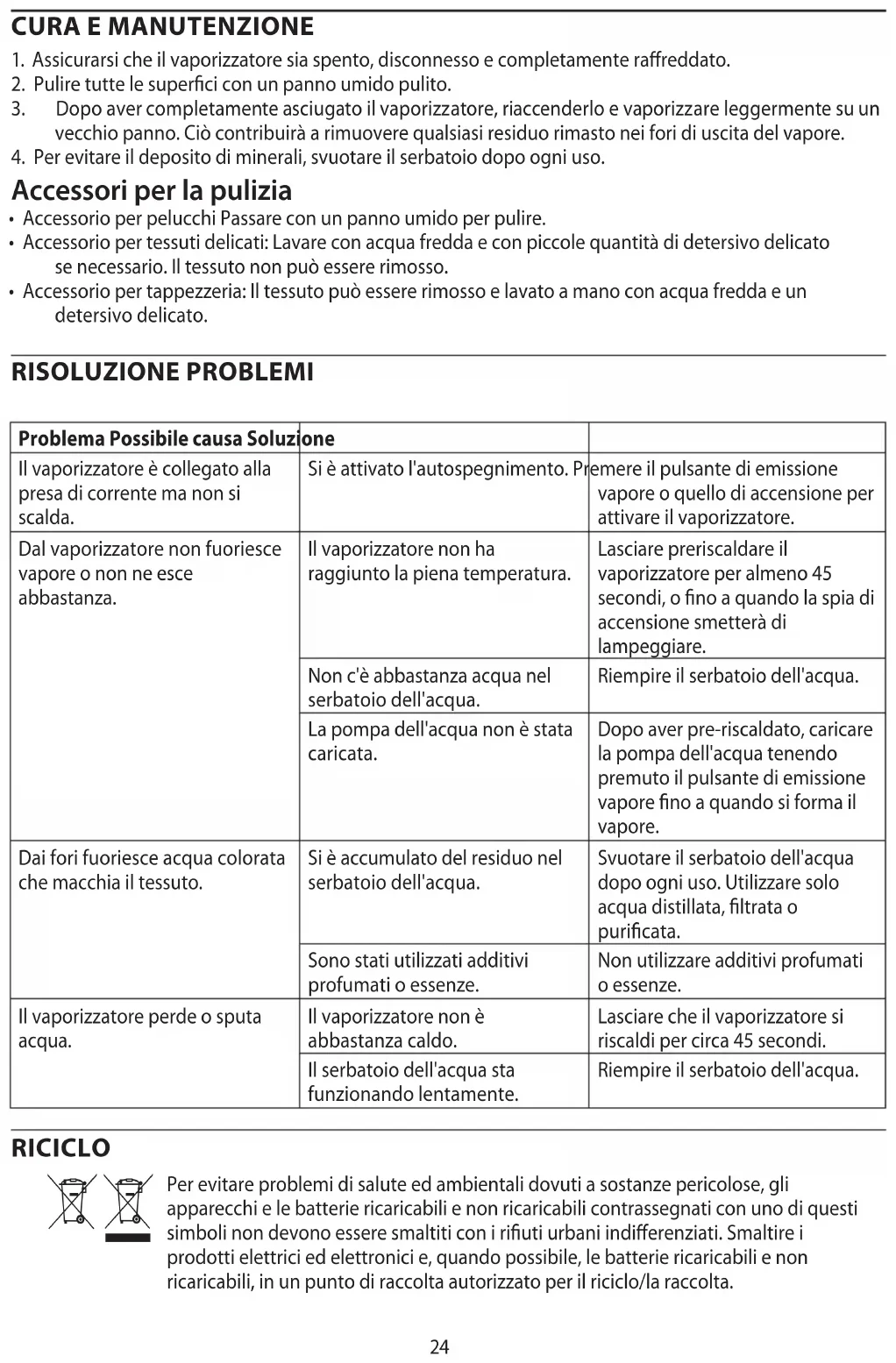 Problema Posible causa Solución El aparato está enchufado pero no se calienta. Se ha activado el apagado automático. Pulse el disparador de vapor o el botón de encendido para activar el aparato. El aparato no produce vapor o el vapor es insuciente. El aparato no ha alcanzado la temperatura necesaria. Espere al menos 45 segundos para que el aparato se caliente o hasta que el piloto del botón de encendido deje de parpadear. El depósito no tiene agua suciente. Llene el depósito de agua. No se ha purgado la bomba de agua. Después de precalentar, purgue la bomba de agua manteniendo pulsado el disparador de vapor hasta que aparezca vapor. Los agujeros desprenden agua decolorada que mancha las prendas. Se ha formado un sedimento de residuos en el depósito de agua. Vacíe el depósito de agua después de cada utilización. Utilice solo agua destilada, ltrada o depurada. Se han añadido perfumes o esencias. No añada perfumes ni esencias. El aparato pierde o escupe agua. El aparato no está lo sucientemente caliente. Espere al menos 45 segundos para que el aparato se caliente. Se está acabando el agua del depósito. Llene el depósito de agua. RECICLAJE