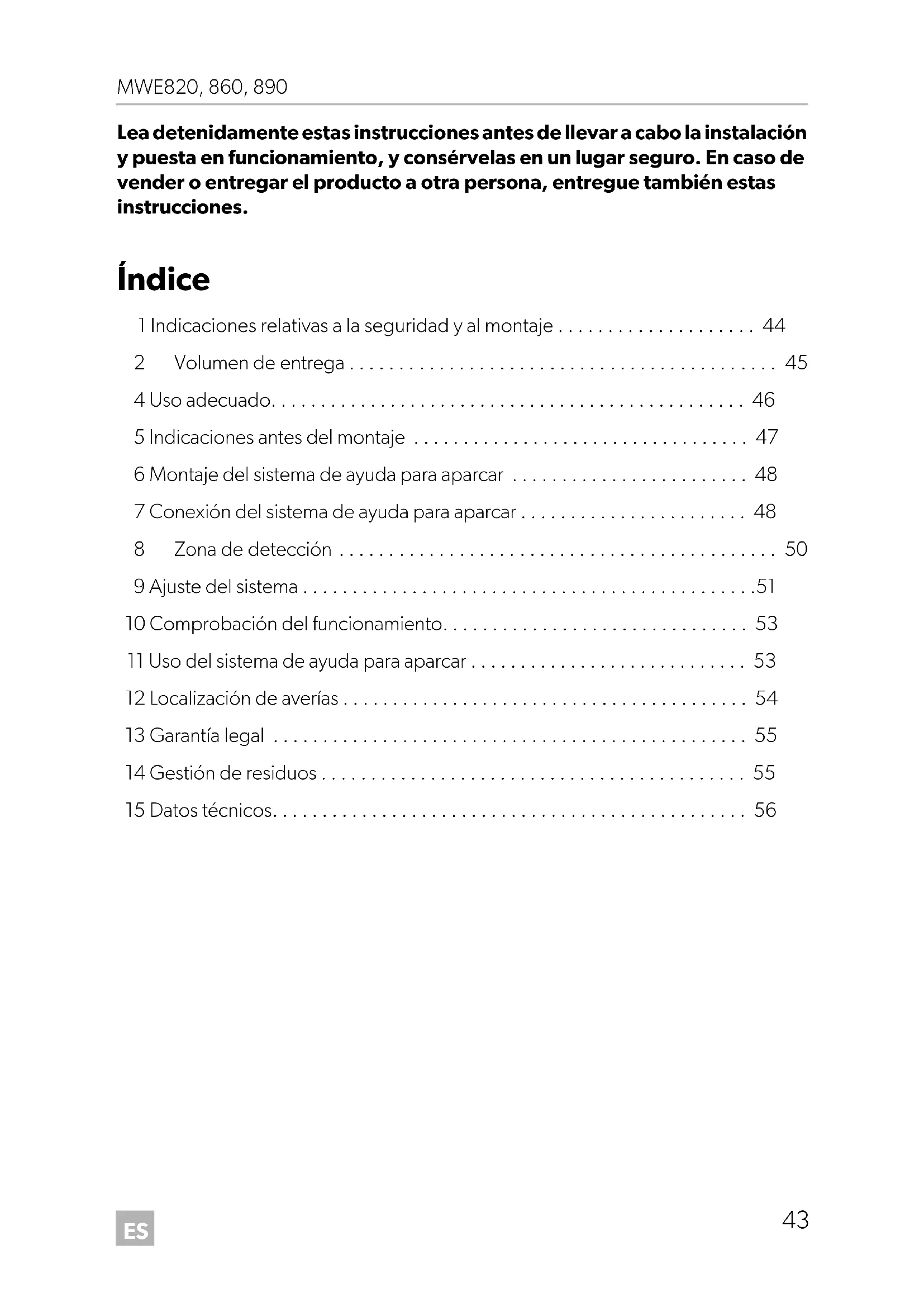 - 15 Datos técnicos MWE820-860-890-IO-16s.book Seite 43 Freitag, 26. August 2016 9:19 21ES Indicaciones relativas a la seguridad y al montaje MWE820, 860, 890 p. 56